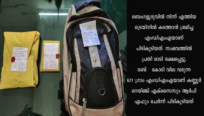 കണ്ണൂര്: കണ്ണൂരില് വന് ലഹരിമരുന്ന് വേട്ട. കണ്ണൂര് റെയില്വേ സ്റ്റേഷനില് നിന്ന് രണ്ട് കോടിയുടെ ലഹരി മരുന്ന് പിടികൂടി. ബെംഗളൂരുവില് നിന്ന് എത്തിയ ട്രെയിനില് കടത്താന് ശ്രമിച്ച എംഡിഎംഎയാണ് പിടികൂടിയത്. സംഭവത്തില് പ്രതി ഓടി രക്ഷപ്പെട്ടു. രണ്ട് കോടി വില വരുന്ന 677 ഗ്രാം എംഡിഎംഎ യാണ് കണ്ണൂർ റെയിഞ്ച് എക്സൈസും ആർ പി എഫും ചേർന്ന് പിടികൂടിയത്. ബെംഗളൂരുവില് നിന്ന് എത്തിയ ട്രെയിനിൽ നിന്നാണ് മയക്ക്മരുന്ന് പിടിച്ചത്.