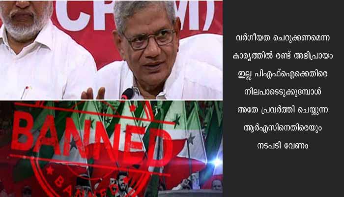 വർഗ്ഗീയതയും തീവ്രവാദവും ഉള്പ്പെടെ ക്രിമിനൽ പ്രവർത്തനങ്ങളിൽ ഏർപ്പെടുന്ന എല്ലാവർക്കും നിയമം ഒരു പോലെ ബാധകമാകണം. ആർഎസ്എസ് നിരോധിക്കണോ എന്ന ചോദ്യത്തിന്, മൂന്ന് തവണ ആർഎസ്എസ് നിരോധിക്കപ്പെട്ടിട്ടുണ്ടെന്നും, നിയമം എല്ലാവർക്കും ഒരുപോലെ ബാധകമാകണമെന്നും യെച്ചൂരി പറഞ്ഞു. നിരോധനം ഒന്നിനും പരിഹാരമല്ല, രാഷ്ട്രീയമായ ഒറ്റപ്പെടുത്തലാണ് പരിഹാരം. പിഎഫ്ഐക്കെതിരായ നടപടി രാഷ്ട്രീയ പ്രേരിതമോ എന്ന ചോദ്യത്തിന് ജനം വിലയിരുത്തുമെന്ന് യെച്ചൂരി മറുപടി നല്കി.