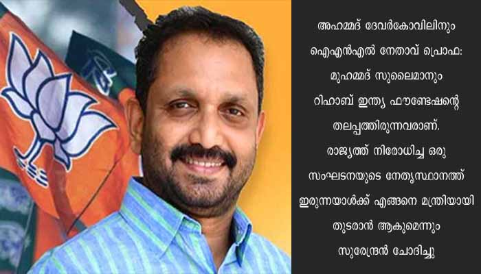 അഹമ്മദ് ദേവർകോവിലിനും ഐഎൻഎൽ നേതാവ് പ്രൊഫ: മുഹമ്മദ് സുലൈമാനും റിഹാബ് ഇന്ത്യ ഫൗണ്ടേഷന്റെ തലപ്പത്തിരുന്നവരാണ്. ഇത്തരത്തിൽ രാജ്യത്ത് നിരോധിച്ച ഒരു സംഘടനയുടെ നേതൃസ്ഥാനത്ത് ഇരുന്നയാൾക്ക് എങ്ങനെ മന്ത്രിയായി തുടരാൻ ആകുമെന്നും സുരേന്ദ്രൻ ചോദിച്ചു. ഐ എൻ എല്ലിനെ ഇടതുമുന്നണി ഒഴിവാക്കണമെന്നും ഇക്കാര്യത്തിൽ മുഖ്യമന്ത്രി പിണറായി വിജയൻ മറുപടി നൽകണമെന്നും ബിജെപി സംസ്ഥാന അധ്യക്ഷൻ ആവശ്യപ്പെട്ടു.