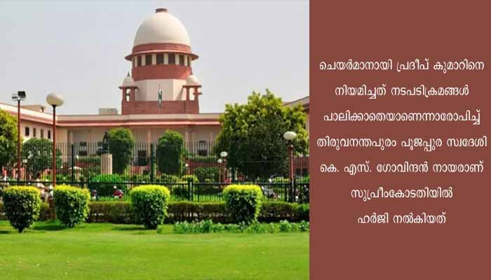 ചെയർമാനായി പ്രദീപ് കുമാറിനെ നിയമിച്ചത് നടപടിക്രമങ്ങൾ പാലിക്കാതെയാണെന്നാരോപിച്ച് തിരുവനന്തപുരം പൂജപ്പുര സ്വദേശി കെ. എസ്. ഗോവിന്ദൻ നായരാണ് സുപ്രീംകോടതിയിൽ ഹർജി നൽകിയത്. 23 അപേക്ഷകൾ ലഭിച്ചതിൽ ഹർജിക്കാരനടക്കം മതിയായ യോഗ്യതയുള്ള 17 പേരെ കണ്ടെത്തിയെങ്കിലും എട്ടുപേരെ മാത്രമാണ് ഇന്റർവ്യൂവിന് വിളിച്ചതെന്ന് ഹർജിയിൽ ആരോപിക്കുന്നു.
