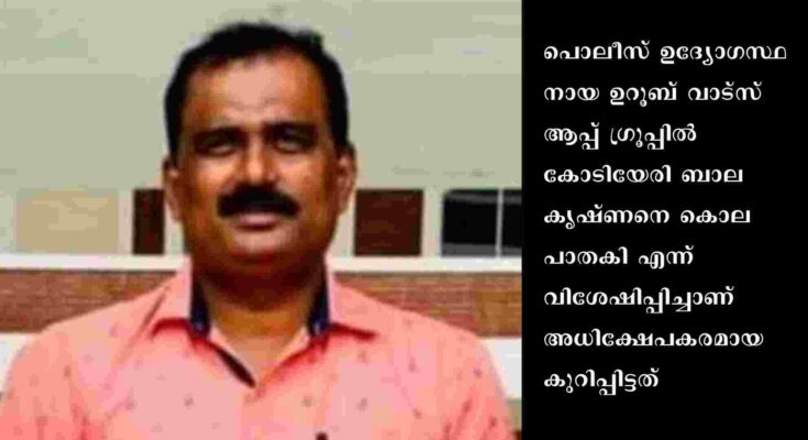 കണ്ണൂർ: സിപിഎം പിബി അംഗമായിരുന്ന കോടിയേരി ബാലകൃഷ്ണന്റെ മരണവുമായി ബന്ധപ്പെട്ട് വാട്സ്ആപ്പിൽ അധിക്ഷേപകരമായ നിലയിൽ പോസ്റ്റും അടിക്കുറിപ്പും പങ്കുവെച്ചതിന് മുല്ലപ്പള്ളി രാമചന്ദ്രന്റെ മുൻ ഗൺ മാൻ ഉറൂബിനെതിരെ ഡിജിപിക്ക് പരാതി. പൊലീസ് ഉദ്യോഗസ്ഥനായ ഉറൂബ് വാട്സ് ആപ്പ് ഗ്രൂപ്പിൽ കോടിയേരി ബാലകൃഷ്ണനെ കൊലപാതകി എന്ന് വിശേഷിപ്പിച്ചാണ് അധിക്ഷേപകരമായ കുറിപ്പിട്ടത്. സിപിഎം ആനകോട് ബ്രാഞ്ച് സെക്രട്ടറിയാണ് ഉറൂബിനെതിരെ പരാതി നൽകിയത്.