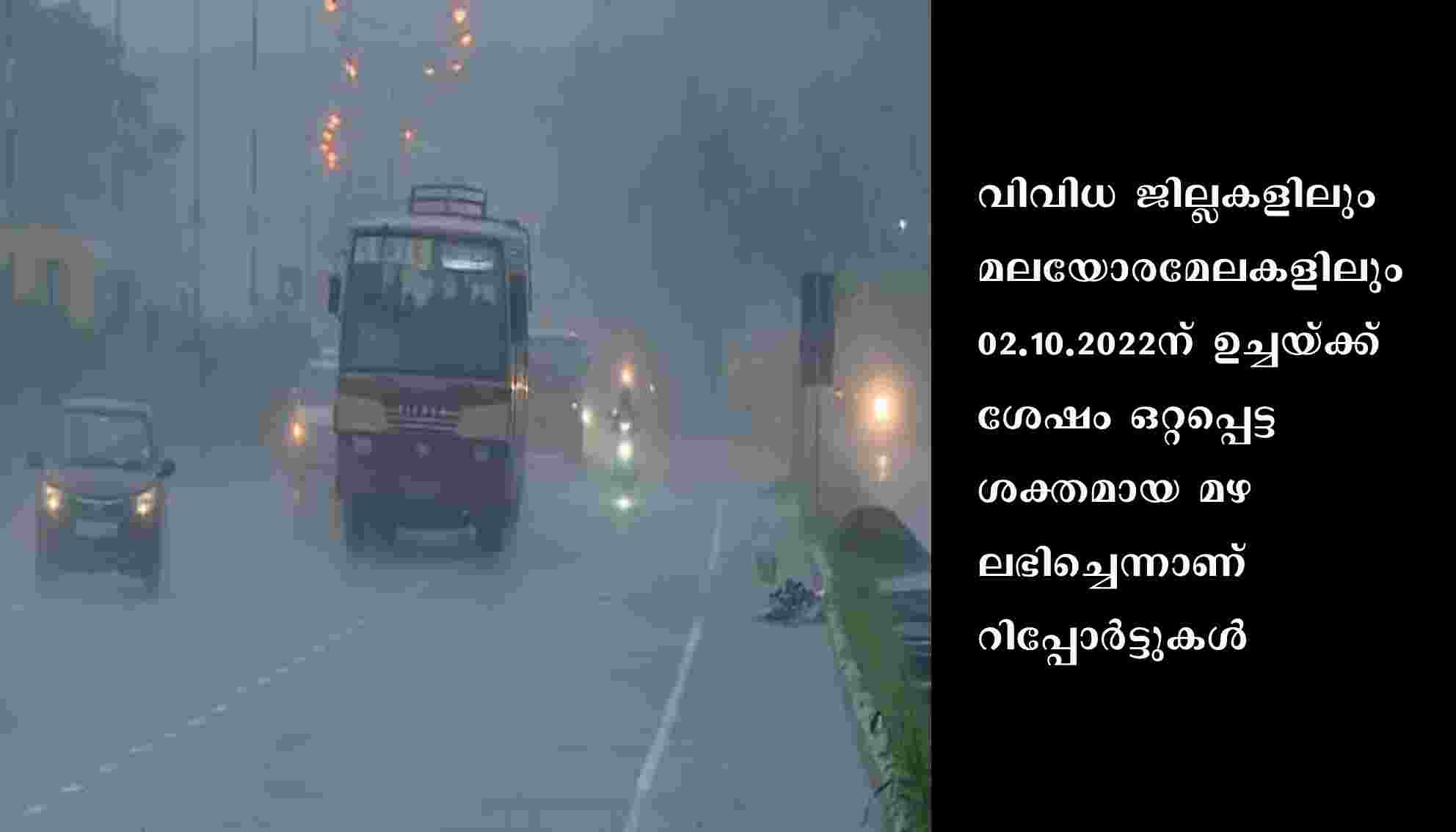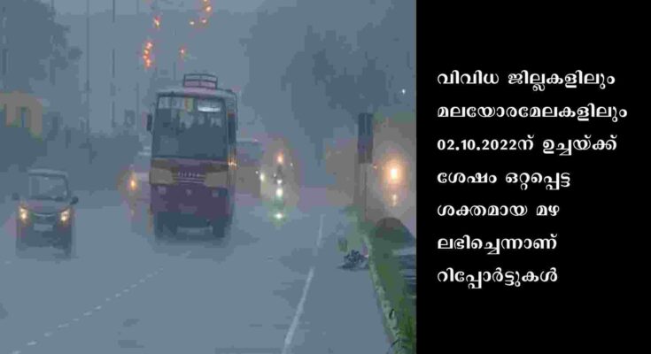 തിരുവനന്തപുരം: സംസ്ഥാനത്ത് വിവിധയിടങ്ങളിൽ കനത്ത മഴ. വിവിധ ജില്ലകളിലും മലയോരമേലകളിലും 02.10.2022ന് ഉച്ചയ്ക്ക് ശേഷം ഒറ്റപ്പെട്ട ശക്തമായ മഴ ലഭിച്ചെന്നാണ് റിപ്പോർട്ടുകൾ. കോഴിക്കോട്ടെ ഉറുമി പുഴയിൽ അപ്രതീക്ഷിതമായി ശക്തമായ മലവെള്ളപ്പാച്ചിലുണ്ടായി. വൃഷ്ടി പ്രദേശത്ത് മഴ കനത്തതോടെ മലമ്പുഴ ഡാമിൻ്റെ ഷട്ടറുകൾ തുറന്നു.