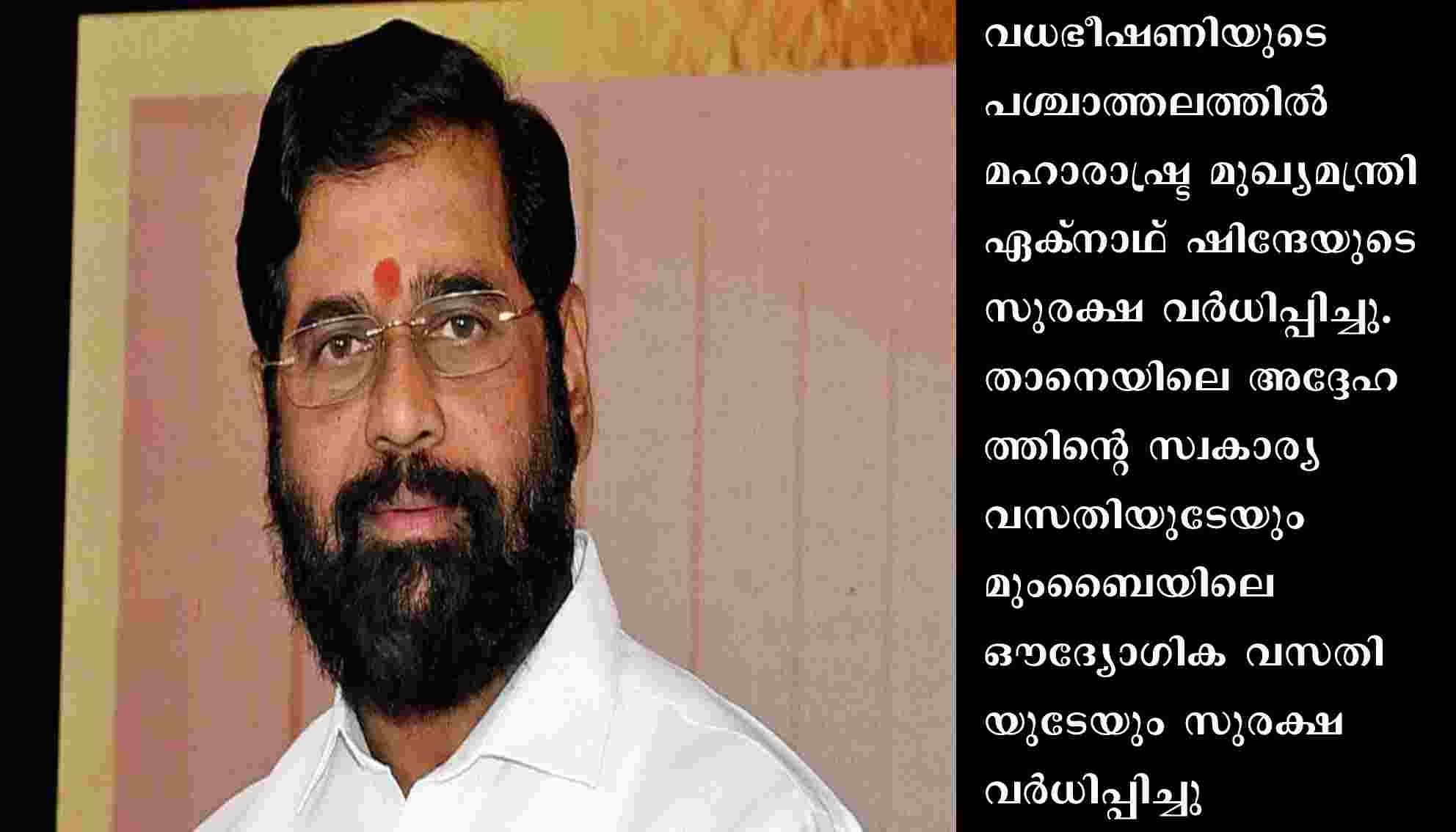 മുംബൈ: വധഭീഷണിയുടെ പശ്ചാത്തലത്തിൽ മഹാരാഷ്ട്ര മുഖ്യമന്ത്രി ഏക്‌നാഥ് ഷിന്ദേയുടെ സുരക്ഷ വർധിപ്പിച്ചു. താനെയിലെ അദ്ദേഹത്തിന്റെ സ്വകാര്യ വസതിയുടേയും മുംബൈയിലെ ഔദ്യോഗിക വസതിയുടേയും സുരക്ഷ വർധിപ്പിച്ചു.