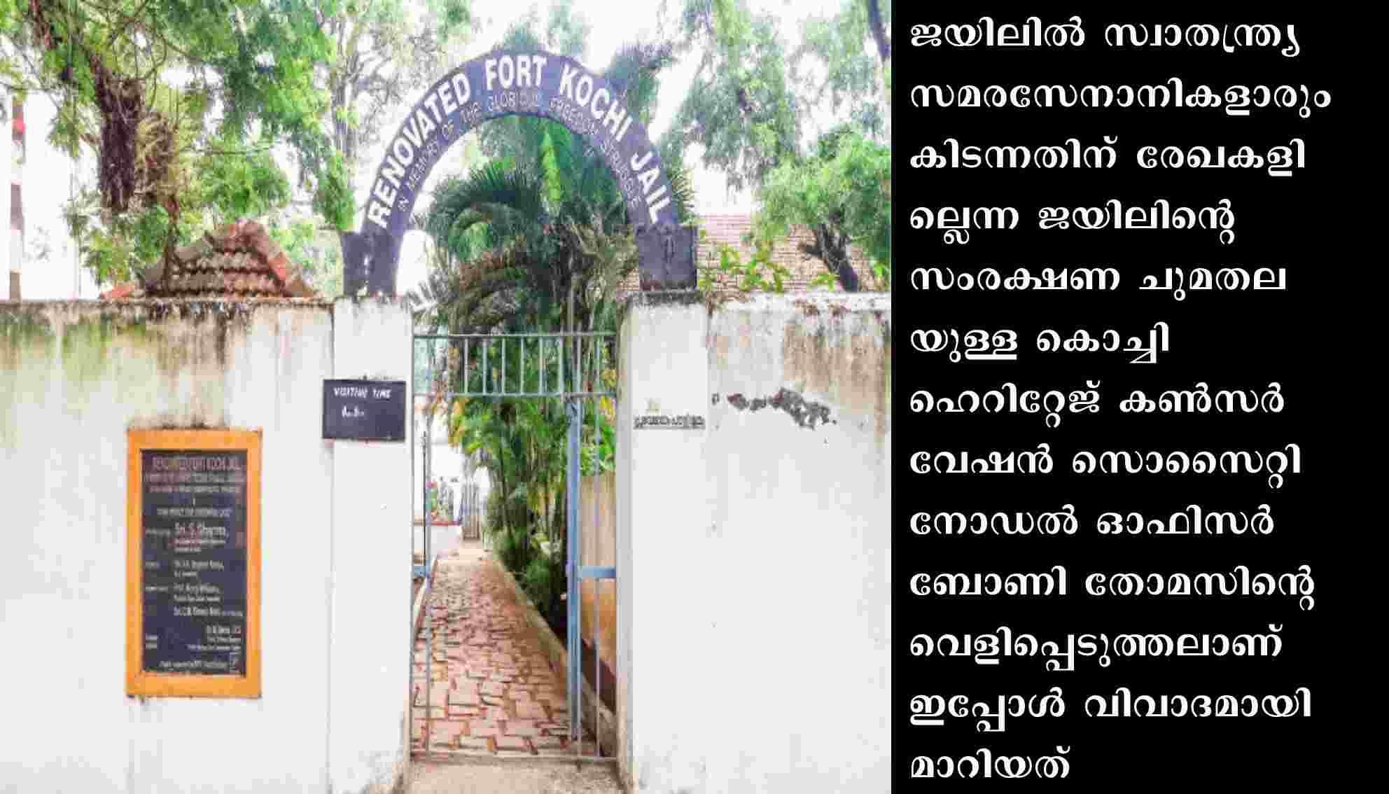 പൈതൃക ജയിൽ വീണ്ടും വിവാദത്തിലേക്ക്. സ്വാതന്ത്ര്യ സമരസേനാനികളാരും ഈ ജയിലിൽ കിടന്നതായി രേഖകളില്ലെന്ന വെളിപ്പെടുത്തലുമായി കൊച്ചി ഹെറിറ്റേജ് കൺസർവേഷൻ സൊസൈറ്റി നോഡൽ ഓഫിസർ ബോണി തോമസ്