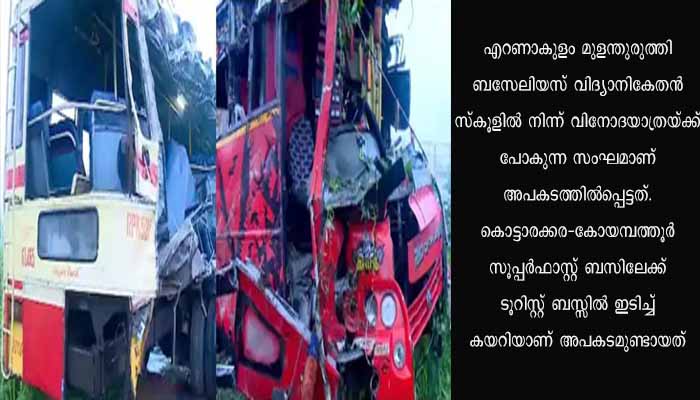 പാലക്കാട്: ദേശീയപാത വടക്കഞ്ചേരിയിൽ വൻ വാഹനാപകടം. കെഎസ്ആര്ടിസി ബസ്സും ടൂറിസ്റ്റ് ബസ്സും കൂട്ടി ഇടിച്ചാണ് അപകടം ഉണ്ടായത്. അപകടത്തില് ഒൻപതു പേർ മരിച്ചു. 12 പേര്ക്ക് ഗുരുതര പരിക്കേറ്റിട്ടുണ്ട്. 12 മണിയോടെയാണ് അപകടമുണ്ടായത്. എറണാകുളം മുളന്തുരുത്തി ബസേലിയസ് വിദ്യാനികേതന് സ്കൂളിൽ നിന്ന് വിനോദയാത്രയ്ക്ക് പോകുന്ന സംഘമാണ് അപകടത്തിൽപ്പെട്ടത്. കൊട്ടാരക്കര – കോയമ്പത്തൂർ സൂപ്പർഫാസ്റ്റ് ബസിലേക്ക് ടൂറിസ്റ്റ് ബസ്സിൽ ഇടിച്ച് കയറിയാണ് അപകടമുണ്ടായത്.
