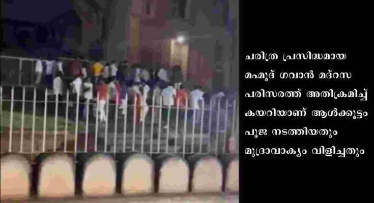 ബെംഗളൂരു: കർണാടകയിലെ ബീദറിൽ ദസറ ആഘോഷത്തിനിടെ ആൾക്കൂട്ടം മദ്റസയിൽ അതിക്രമിച്ചു കയറി പൂജ നടത്തിയെന്ന് പരാതി. ചരിത്ര പ്രസിദ്ധമായ മഹ്മൂദ് ഗവാൻ മദ്റസ പരിസരത്ത് അതിക്രമിച്ച് കയറിയാണ് ആൾക്കൂട്ടം പൂജ നടത്തിയതും മുദ്രാവാക്യം വിളിച്ചതും. 1460-കളിൽ പണികഴിപ്പിച്ച മദ്റസ ആർക്കിയോളജിക്കൽ സർവേ ഓഫ് ഇന്ത്യയുടെ കീഴിലാണ്. ദേശീയ പ്രാധാന്യമുള്ള സ്മാരകങ്ങളുടെ പട്ടികയിലും മദ്റസ ഉൾപ്പെടുന്നു. സംഭവത്തിൽ ബീദർ പൊലീസ് ഒമ്പത് പേർക്കെതിരെ പൊലീസ് കേസെടുത്തെങ്കിലും ഇതുവരെ ആരെയും അറസ്റ്റ് ചെയ്തിട്ടില്ല. കുറ്റക്കാരെ ഉടൻ അറസ്റ്റ് ചെയ്തില്ലെങ്കിൽ പ്രക്ഷോഭം നടത്തുമെന്ന് മുസ്ലീം സംഘടനകൾ മുന്നറിയിപ്പ് നൽകി. പ്രതികളെ പിടികൂടുമെന്ന് പൊലീസ് നൽകിയ ഉറപ്പിലാണ് മുസ്ലിം സംഘടനാ പ്രവർത്തകർ പ്രതിഷേധം അവസാനിപ്പിച്ചത്.