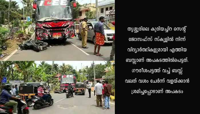 തൃശ്ശൂരിലെ കുരിയച്ചിറ സെന്റ് ജോസഫ്സ് സ്കൂളിൽ നിന്ന് വിദ്യാർത്ഥികളുമായി എത്തിയ ബസ്സാണ് അപകടത്തിൽപെട്ടത്. ഗൗരീശപട്ടത്ത് വച്ച് ബസ്സ് വലത് വശം ചേർന്ന് വളയ്ക്കാൻ ശ്രമിച്ചപ്പോഴാണ് അപകടം. എതിർ ദിശയിൽ വളവ് തിരിഞ്ഞ് വന്ന സ്കൂട്ടറിനെ ബസ്സ് ഇടിച്ചു വീഴ്ത്തുകയായിരുന്നു.