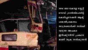 തിരുവനന്തപുരം: വടക്കഞ്ചേരിയിൽ നടന്ന അപകടത്തിൽ മരണമടഞ്ഞ മൂന്ന് കെഎസ്ആർടിസി യാത്രക്കാർക്കുള്ള ഇൻഷുറൻസ് തുകയായ 10 ലക്ഷം രൂപ വേഗത്തിൽ ലഭ്യമാക്കുന്നതിനുള്ള നടപടി സ്വീകരിച്ചുവെന്ന് കെ.എസ്.ആർ.ടി.സി. 2014-ലെ കേരള സ്റ്റേറ്റ് റോഡ് ട്രാൻസ്പോർട്ട് കോർപ്പറേഷൻ ആക്ട് പദ്ധതിപ്രകാരം യാത്രക്കാർക്ക് നൽകിവരുന്ന അപകട ഇൻഷുറൻസ് പ്രകാരമാണ് തുക നൽകുന്നത്.