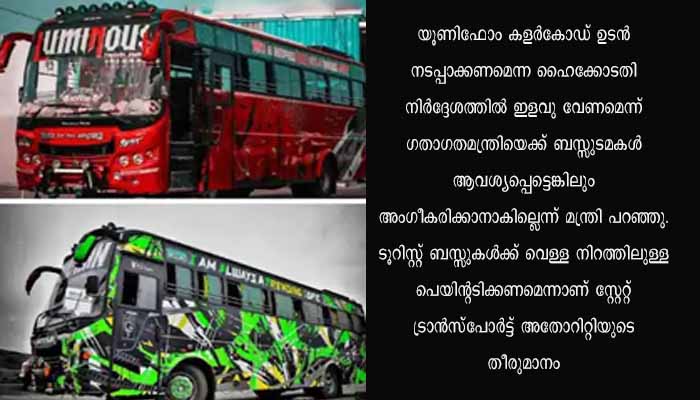 പെട്ടെന്ന് ഒരു ദിവസം കളർകോഡ് നടപ്പിലാക്കണം എന്ന് പറഞ്ഞാൽ പ്രായോഗികമാകില്ലെന്ന് ബസ്സുടമകള് പറഞ്ഞു. ഒന്നോ രണ്ടോ ശതമാനം പേർ ചെയ്യുന്ന നിയമലംഘനങ്ങൾ എല്ലാവരുടെയും ചുമലിൽ ചാരുന്നത് ശരിയല്ല. 7000 ടൂറിസ്റ്റ് ബസ്സുകളുണ്ട്. പെട്ടെന്ന് എല്ലാം വെള്ളയടിക്കാനുള്ള വർക് ഷോപ് സംവിധാനം ഇല്ല. വാഹനം രജിസ്റ്റർ ചെയ്യുന്ന സമയത്ത് ഉള്ള കളറിൽ ഓടാൻ സമ്മതിക്കണം. അടുത്ത ഫിറ്റ്നസ് വരുമ്പോ മാറ്റാം എന്നാവശ്യപ്പെട്ടു. എല്ലാം കൂടി പറഞ്ഞാൽ ഒന്നും ചെയ്യാനാകില്ല.സ്പീഡ് ഗവർണർ സംഘടന അംഗീകരിക്കുന്നു. 60 കിമീ സ്പീഡിൽ നാല് ഗിയർ പോലും ഇടാൻ ആകില്ല. ഓടിയെത്തുകയുമില്ല. ആവശ്യങ്ങളും നിർദേശങ്ങളും പരിശോധിക്കാമെന്ന് മന്ത്രി പറഞ്ഞു. ഉടനെ കളർകോഡിലേക്ക് മാറണം എന്ന് പറയുന്നത് അപ്രായോഗികമാണെന്നാണ് ബസ്സുടമകളുടെ നിലപാട്. സമയപരിധി നീട്ടണമെന്നാണ് ആവശ്യം. ഒന്നോ രണ്ടോ ശതമാനം നടത്തുന്ന നിയമലംഘനങ്ങളെ പർവതീകരിക്കുന്നു. സർക്കാർ തീരുമാനം അംഗീകരിക്കാനാവില്ല. സ്പീഡ് ഗവർണർ നടപ്പിലാക്കേണ്ട കാര്യമാണ്. സ്വിഫ്റ്റ് ബസുകളുടെ വേഗത 90 km ആണ്. വേഗത എല്ലാവർക്കും ഒരുപോലെയാകണെന്നും ബസ്സുടമകള് പറഞ്ഞു.