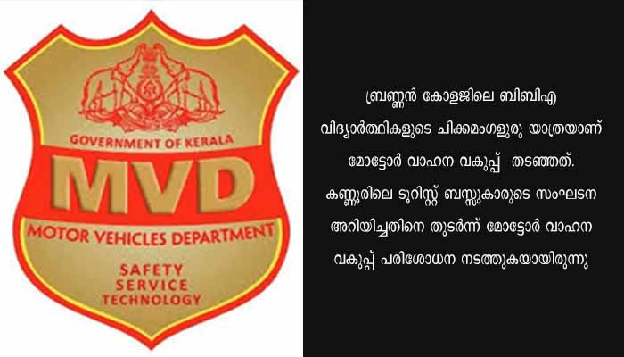 പാലക്കാട്: ടൂറിസ്റ്റ് ബസ്സിൽ നിയമലംഘനം കണ്ടെത്തിയതിനെ തുടർന്ന് വിദ്യാർത്ഥികളുടെ വിനോദയാത്ര തടഞ്ഞ് മോട്ടോർ വാഹന വകുപ്പ്. ബ്രണ്ണൻ കോളജിലെ ബിബിഎ വിദ്യാർത്ഥികളുടെ ചിക്കമംഗളുരു യാത്രയാണ് മോട്ടോർ വാഹന വകുപ്പ് തടഞ്ഞത്. കോഴിക്കോട് നിന്നെത്തിയതാണ് ബസ്സ്. കണ്ണൂരിലെ ടൂറിസ്റ്റ് ബസ്സുകാരുടെ സംഘടന അറിയിച്ചതിനെ തുടർന്ന് മോട്ടോർ വാഹന വകുപ്പ് പരിശോധന നടത്തുകയായിരുന്നു. വിദ്യാർത്ഥികളെ കയറ്റുന്നതിന് തൊട്ടു മുൻപാണ് മോട്ടോർ വാഹന വകുപ്പ് അധികൃതരെത്തി പരിശോധന നടത്തി യാത്ര തടഞ്ഞത്.