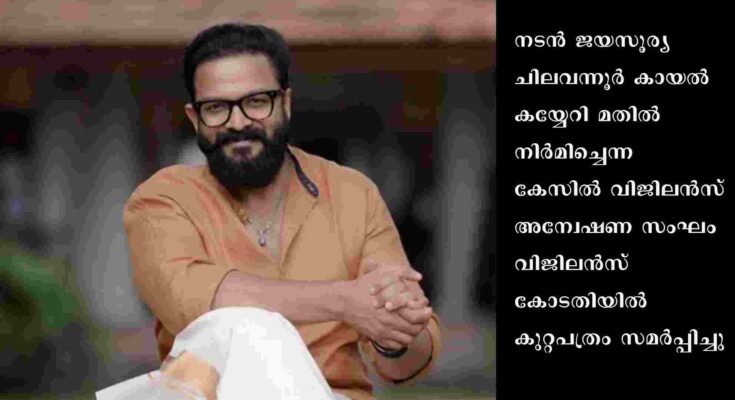 മൂവാറ്റുപുഴ: നടൻ ജയസൂര്യ ചിലവന്നൂർ കായൽ കയ്യേറി മതിൽ നിർമിച്ചെന്ന കേസിൽ വിജിലൻസ് അന്വേഷണ സംഘം വിജിലൻസ് കോടതിയിൽ കുറ്റപത്രം സമർപ്പിച്ചു. ഹർജിക്കാരനായ ഗിരീഷ് ബാബു കോടതിയിൽ ഹർജി ഫയൽ ചെയ്തതോടെയാണു 2022 ഒക്ടോബർ 17ന് കുറ്റപത്രം സമർപ്പിച്ചത്. മൂവാറ്റുപുഴ വിജിലൻസ് കോടതി നേരത്തെ എഫ്ഐആർ രജിസ്റ്റർ ചെയ്തെങ്കിലും 6 വർഷമായിട്ടും കുറ്റപത്രം സമർപ്പിച്ചിരുന്നില്ല.