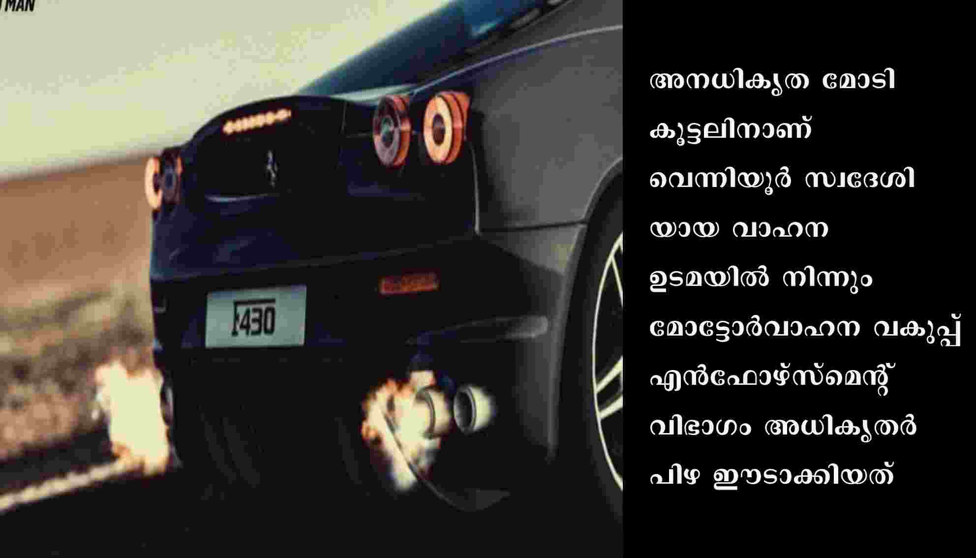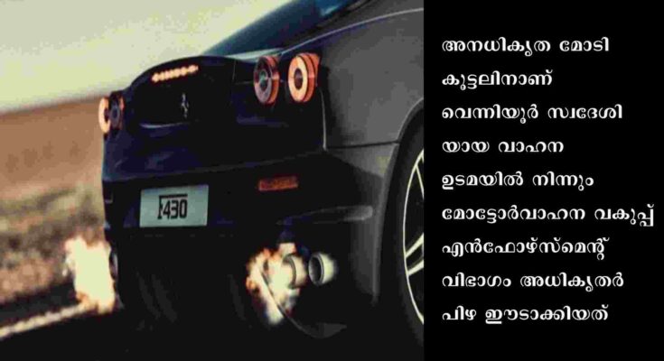 തിരൂരങ്ങാടി: മലപ്പുറത്ത് തീപാറുന്ന കാറില് കറങ്ങിയ യുവാവിന് മോട്ടോര് വാഹന വകുപ്പ്ഉദ്യോഗസ്ഥരുടെ മുന്നില് പെട്ടപ്പോള് ഒറ്റയടിക്ക് കീശയില്നിന്ന് പോയത് 44,250 രൂപ. അനധികൃത മോടികൂട്ടലിനാണ് വെന്നിയൂര് സ്വദേശിയായ വാഹന ഉടമയില് നിന്നും മോട്ടോര്വാഹന വകുപ്പ് എന്ഫോഴ്സ്മെന്റ് വിഭാഗം അധികൃതര് പിഴ ഈടാക്കിയത്.