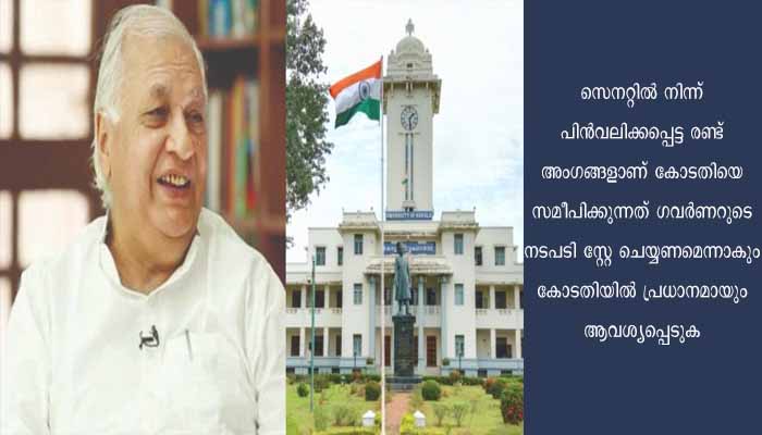 സെനറ്റില് നിന്ന് പിന്വലിക്കപ്പെട്ട രണ്ട് അംഗങ്ങളാണ് കോടതിയെ സമീപിക്കുന്നത്. ഇതില് അന്തിമ തീരുമാനം 20/10/22 വ്യാഴാഴ്ചയുണ്ടാകും. കേസില് ഗവര്ണര്ക്കെതിരായ നിലപാടാണ് സര്വകലാശാല കൈക്കൊള്ളുക. ഗവര്ണറുടെ നടപടി സ്റ്റേ ചെയ്യണമെന്നാകും കോടതിയില് പ്രധാനമായും ആവശ്യപ്പെടുക. സ്റ്റേ അനുവദിച്ചാല് അടുത്ത സെനറ്റ് യോഗത്തില് ആ അംഗങ്ങളെ പങ്കെടുപ്പിക്കാന് കഴിയും. ഇതിലൂടെ ഗവര്ണര്ക്ക് തിരിച്ചടി നല്കാന് കഴിയുമെന്നാണ് സിപിഐഎം നീക്കം.