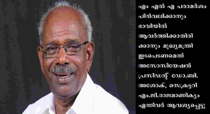 എംഎൽഎയി ൽനിന്നുണ്ടായ പരാമർശം സംസ്ഥാനത്തെ മുഴുവൻ ഐഎഎസ് ഉദ്യോഗസ്ഥരുടെയും മനോവീര്യം തകർക്കുന്നതാണ്. എംഎൽഎ പരാമർശം പിൻവലിക്കാനും ഭാവിയിൽ ആവർത്തിക്കാതിരിക്കാനും മുഖ്യമന്ത്രി ഇടപെടണമെന്ന് അസോസിയേഷൻ പ്രസിഡന്റ് ഡോ.ബി.അശോക്, സെക്രട്ടറി എം.ജി.രാജമാണിക്യം എന്നിവർ ആവശ്യപ്പെട്ടു. ഇടുക്കിയിലെ ഭൂവിഷയത്തിൽ സിപിഎം സമരത്തിലെ പ്രസംഗത്തിനിടെ സബ്കലക്ടറെ മണി ‘തെമ്മാടി’ എന്നു വിശേഷിപ്പിച്ചതിനെതിരെയാണ് പ്രതിഷേധം