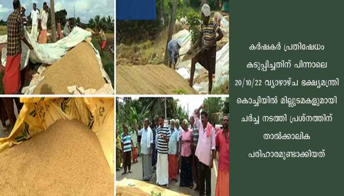 അമ്പത്തിനാലോളം മില്ലുടമകൾ രണ്ടാഴ്ചയായി നെല്ല് സംഭരിക്കാതെ നടത്തി വന്ന സമരമാണ് 20/10/22 വ്യാഴാഴ്ച അവസാനിപ്പിച്ചത്. നെല്ലെടുക്കാൻ മില്ലുടമകൾ വരുമെന്ന പ്രതീക്ഷയിൽ കുട്ടനാട്ടിലടക്കം നെല്ല് കൊയ്ത് പാടത്ത് കൂട്ടിയ  കർഷകർക്ക് ഇതോടെ ആശ്വാസമായി. കർഷകർ പ്രതിഷേധം കടുപ്പിച്ചതിന് പിന്നാലെ 20/10/22 വ്യാഴാഴ്ച ഭക്ഷ്യമന്ത്രി കൊച്ചിയിൽ മില്ലുടമകളുമായി ചർച്ച നടത്തി പ്രശ്നത്തിന് താൽക്കാലിക പരിഹാരമുണ്ടാക്കിയത്.