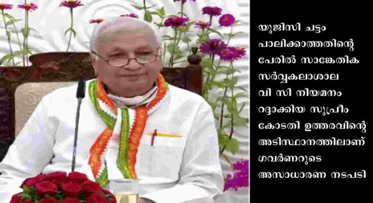 അതിനിടെ ഗവർണ്ണർക്ക് മറുപടി നൽകാൻ രാവിലെ പത്തരക്ക് മുഖ്യമന്ത്രി പാലക്കാട് വാർത്ത സമ്മേളനം വിളിച്ചിട്ടുണ്ട്.രാജി വെക്കാൻ ഗവർണ്ണർ നിർദേശിച്ച 9 പേരിൽ ഉൾപ്പെട്ട കേരള വി സി യുടെ കാലാവധി 23/10/2022 തീരും.ആരോഗ്യ സർവകലാശാല വിസിക്ക് കേരളയുടെ ചുമതല നൽകിയെക്കും. ഡിജിറ്റൽ സർവ്വകലാശാല വിസിക്കും ശ്രീനാരായണ ഓപ്പൺ സർവ്വകലാശാല വിസിക്കും എതിരെയും നടപടിക്ക് സാധ്യത ഉണ്ട്. യുജിസി മാനദണ്ഡം പാലിക്കാതെ ഉള്ള നിയമനങ്ങളിൽ ആണ് ഗവർണ്ണറുടെ കൂട്ട നടപടി