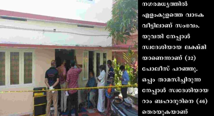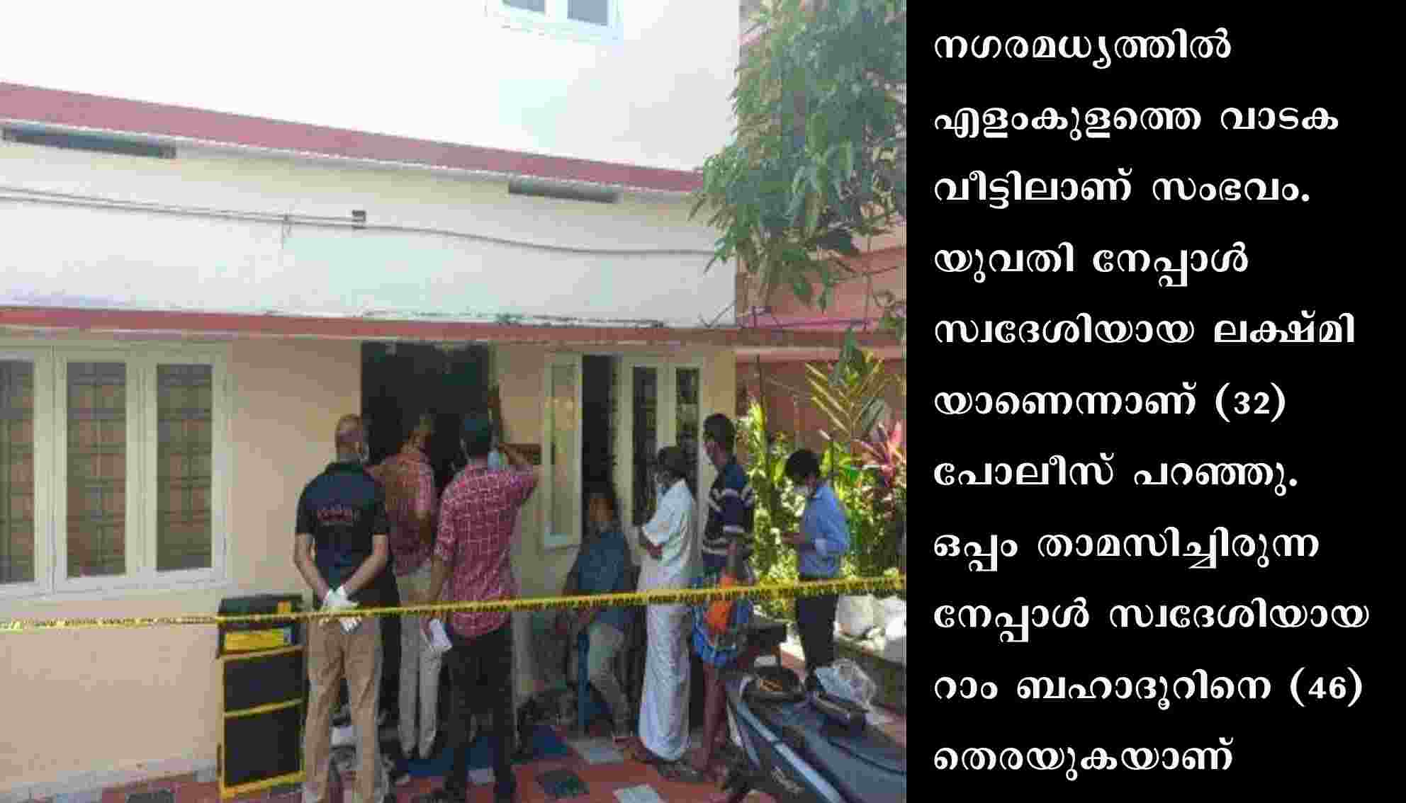 കൊച്ചി: നഗരത്തെ നടുക്കി വീണ്ടും കൊലപാതകം. യുവതിയെ കഴുത്തറുത്ത് കൊന്ന് പ്ലാസ്റ്റിക്ക് കവറില്‍ പൊതിഞ്ഞ നിലയില്‍ കണ്ടെത്തി. നഗരമധ്യത്തില്‍ എളംകുളത്തെ വാടകവീട്ടിലാണ് സംഭവം. യുവതി നേപ്പാള്‍ സ്വദേശിയായ ലക്ഷ്മിയാണെന്നാണ് (32) പോലീസ് പറഞ്ഞു. ഒപ്പം താമസിച്ചിരുന്ന നേപ്പാള്‍ സ്വദേശിയായ റാം ബഹാദൂറിനെ (46) തെരയുകയാണ്. ഇരുവരും ഒന്നരവര്‍ഷമായി ഇവിടെ കഴിഞ്ഞുവരികയാണ്.