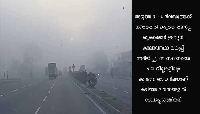 ബെംഗളൂരു നഗരത്തില് 15.4 ഡിഗ്രി സെൽഷ്യസാണ് കഴിഞ്ഞ ദിവസം രേഖപ്പെടുത്തിയത്. ഇത് സാധാരണയേക്കാൾ 4 ഡിഗ്രി സെൽഷ്യത്തിന് താഴെയാണ്. അടുത്ത 3 – 4 ദിവസത്തേക്ക് നഗരത്തില് കടുത്ത തണുപ്പ് തുടരുമെന്ന് ഇന്ത്യൻ കാലാവസ്ഥാ വകുപ്പ് അറിയിച്ചു. സംസ്ഥാനത്തെ പല ജില്ലകളിലും കുറഞ്ഞ താപനിലയാണ് കഴിഞ്ഞ ദിവസങ്ങളില് രേഖപ്പെടുത്തിയത്.