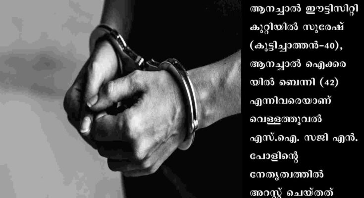 അടിമാലി: മുക്കുടം സെന്റ് സെബാസ്റ്റിയന്സ് പള്ളിയിലെ മുറി കുത്തിതുറന്ന് വാര്പ്പ് ഉള്പ്പെടെയുള്ള സമാഗ്രികള് മോഷ്ടിച്ച സംഭവത്തില് രണ്ടുപേര് അറസ്റ്റില്. ആനച്ചാല് ഈട്ടിസിറ്റി കുറ്റിയില് സുരേഷ് (കുട്ടിച്ചാത്തന്-40), ആനച്ചാല് ഐക്കരയില് ബെന്നി (42) എന്നിവരെയാണ് വെള്ളത്തൂവല് എസ്.ഐ. സജി എന്. പോളിന്റെ നേതൃത്വത്തില് അറസ്റ്റ് ചെയ്തത്. മങ്കുവ സ്വദേശി ഷൈസിനായി തെരച്ചില് തുടരുകയാണ്.