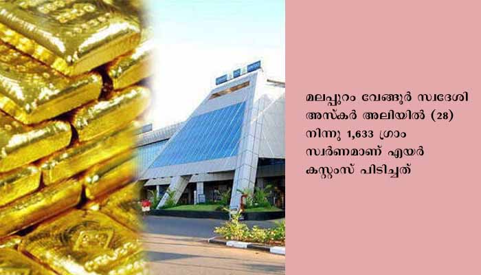 മലപ്പുറം വേങ്ങൂര് സ്വദേശി അസ്കര് അലിയില് (28) നിന്നു 1,633 ഗ്രാം സ്വര്ണമാണ് എയര് കസ്റ്റംസ് പിടിച്ചത്. ബാഗേജ് പരിശോധനയില് സംശയം തോന്നിയതിനെത്തുടര്ന്ന് വിശദമായി നടത്തിയ പരിശോധനയിലാണ് രണ്ടു എമര്ജന്സി ലൈറ്റുകളുടെ ബാറ്ററിക്കുള്ളില് ഒളിപ്പിച്ച 14 സ്വര്ണ പ്ലേറ്റുകള് ലഭിക്കുന്നത്. ഇയാള് ദോഹയില്നിന്നുള്ള ഖത്തര് എയര്വേസ് വിമാനത്തിലാണ് കരിപ്പൂരിലെത്തിയത്. സ്വര്ണത്തിന് ഒരു കോടിക്ക് മുകളില് രൂപ വില ലഭിക്കും.