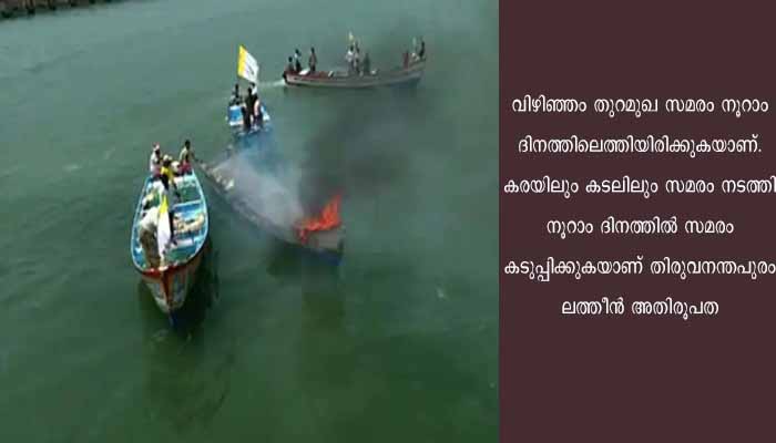 വിഴിഞ്ഞം തുറമുഖ സമരം 27/10/22 വ്യാഴാഴ്ച നൂറാം ദിനത്തിലെത്തിയിരിക്കുകയാണ്. കരയിലും കടലിലും സമരം നടത്തി നൂറാം ദിനത്തിൽ സമരം കടുപ്പിക്കുകയാണ് തിരുവനന്തപുരം ലത്തീൻ അതിരൂപത. മുതലപ്പൊഴിയിൽ നിന്ന് കടൽ വഴി പോർട്ടിന് അടുത്തെത്തി ശക്തമായ മുന്നറിയിപ്പ് നൽകാനാണ് സമരസമിതിയുടെ നീക്കം. രാവിലെ 10 മണി മുതൽ ഉച്ചക്ക് 1 മണി വരെ സംഘടിപ്പിക്കുന്ന പ്രതിഷേധ സമരത്തിൽ 100ൽ അധികം മത്സ്യബന്ധന വള്ളങ്ങൾ കടലിൽ പ്രതിഷേധം തീർക്കുകയാണ്. പുതുകുറിച്ചി, അഞ്ചുതെങ്ങ് ഫെറോനകളുടെ നേതൃത്വത്തിലാണ് കടൽ വഴിയുള്ള സമരം.