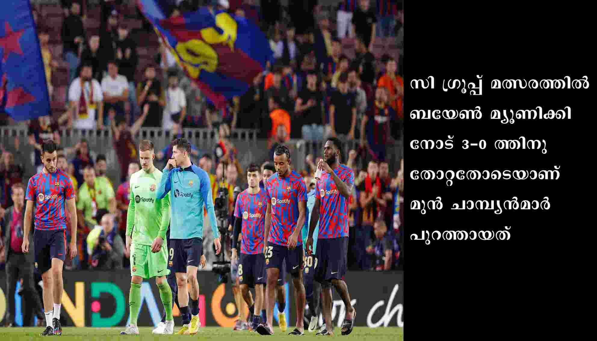 മാഡ്രിഡ്: സ്പാനിഷ് ക്ലബ് ബാഴ്സലോണ ചാമ്പ്യന്സ് ലീഗ് ഫുട്ബോള് ലീഗ് ഗ്രൂപ്പ് ഘട്ടത്തില് തന്നെ പുറത്ത്. സി ഗ്രൂപ്പ് മത്സരത്തില് ബയേണ് മ്യൂണിക്കിനോട് 3-0 ത്തിനു തോറ്റതോടെയാണ് മുന് ചാമ്പ്യന്മാര് പുറത്തായത്.മറ്റൊരു മത്സരത്തില് ഇന്റര് മിലാന് വിക്ടോറിയ പ്ലാസാനെ 4-0 ത്തിനു തോല്പ്പിച്ചതും ബാഴ്സയ്ക്കു തിരിച്ചടിയായി. അഞ്ച് കളികളില് നിന്ന് 15 പോയിന്റ് നേടിയ ബയേണ് മ്യൂണിക്ക് ഒന്നാമത് ഫിനിഷ് ചെയ്തു. പത്ത് പോയിന്റ് നേടിയ ഇന്റര് മിലാന് രണ്ടാമതായി. അഞ്ച് കളികളില് നിന്ന് നാലു പോയിന്റാണ് ബാഴ്സയുടെ നേട്ടം.