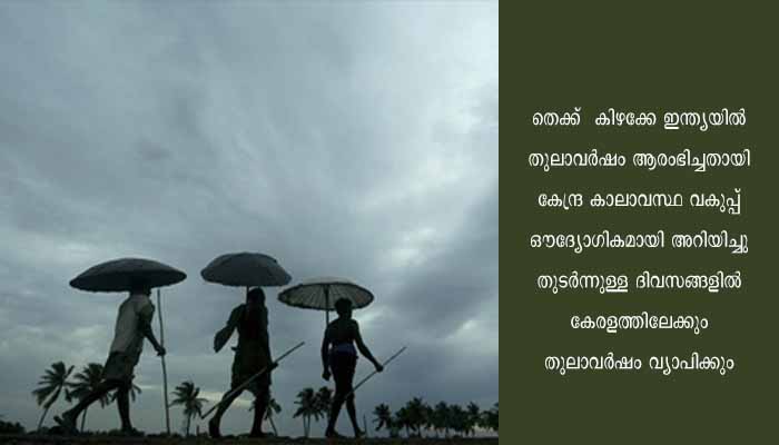 തെക്ക് കിഴക്കേ ഇന്ത്യയിൽ തുലാവർഷം ആരംഭിച്ചതായി കേന്ദ്ര കാലാവസ്ഥ വകുപ്പ് ഔദ്യോഗികമായി അറിയിച്ചു. തമിഴ്നാട്, പുതുച്ചേരി, ആന്ധ്രാപ്രാദേശിന്റെ തെക്കൻ തീരങ്ങളിൽ തുലാവർഷം ആരംഭിച്ചതായി കേന്ദ്ര കാലാവസ്ഥ വകുപ്പ് വ്യക്തമാക്കി.തുടർന്നുള്ള ദിവസങ്ങളിൽ കേരളത്തിലേക്കും തുലാവർഷം വ്യാപിക്കും. തെക്കൻ കേരളത്തിൽ വ്യാപകമായി ശക്തമായ മഴയ്ക്ക് സാധ്യതയുണ്ട്. ഉച്ചയ്ക്ക് ശേഷം കിഴക്കൻ മേഖലയിൽ നിന്ന് ആരംഭിക്കുന്ന ഇടിമിന്നലോട് കൂടിയ മഴയാണ് തുലാവർഷത്തിന്റെ പ്രത്യേകത. കൊല്ലം, പത്തനംതിട്ട, ആലപ്പുഴ, കോട്ടയം, ഇടുക്കി, പാലക്കാട് ജില്ലകളിൽ 30/10/22 ഞായറാഴ്ച യെല്ലോ അലർട്ട് പ്രഖ്യാപിച്ചു. 01/11/22 ചൊവ്വാഴ്ച്ച 7 ജില്ലകളിലും, 02/11/22 ബുധനാഴ്ച്ച 8 ജില്ലകളിലും യെല്ലോ മുന്നറിയിപ്പ് നൽകി.