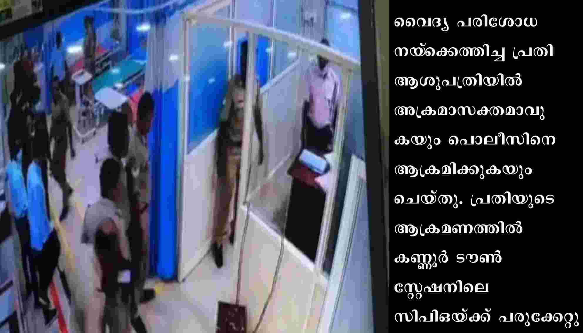 തുടർന്ന് ഇയാളെ വൈദ്യ പരിശോധനക്ക് വേണ്ടി ആശുപത്രിയിൽ എത്തിച്ചപ്പോഴായിരുന്നു അതിക്രമം. മുറിയിലെ ചില്ല് ഇയാൾ തലകൊണ്ട് അടിച്ച് പൊട്ടിച്ചു. അക്രമത്തിൽ ടൗൺ എസ്‌ഐ എ ഇബ്രാഹിം, സിവിൽ പൊലീസ് ഓഫീസർമാരായ എം ടി അനൂപ്, കെ നവീൻ എന്നിവർക്കും പരുക്കേറ്റു