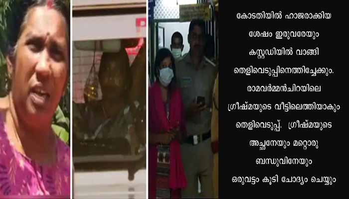 കോടതിയിൽ ഹാജരാക്കിയ ശേഷം ഇരുവരേയും കസ്റ്റഡിയിൽ വാങ്ങി തെളിവെടുപ്പിനെത്തിച്ചേക്കും. രാമവര്മ്മൻചിറയിലെ ഗ്രീഷ്മയുടെ വീട്ടിലെത്തിയാകും തെളിവെടുപ്പ്. ഗ്രീഷ്മയുടെ അച്ഛനേയും മറ്റൊരു ബന്ധുവിനേയും ഒരുവട്ടം കൂടി ചോദ്യം ചെയ്യും.