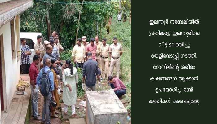 ഇലന്തൂർ നരബലിയിൽ പ്രതികളെ ഇലന്തൂരിലെ വീട്ടിലെത്തിച്ചു തെളിവെടുപ്പ് നടത്തി. റോസ്ലിന്റെ ശരീരം കഷണങ്ങൾ ആക്കാൻ ഉപയോഗിച്ച രണ്ട് കത്തികൾ കണ്ടെടുത്തു. ഇറച്ചി വെട്ടുന്ന കത്തികൾക്ക് സമാനമായ കത്തികൾ ആണ് കണ്ടെത്തിയത്. റോസ്ലിന്റെ ആഭരണവും കണ്ടെടുത്തു. ഒരുഗ്രാമിൽ താഴെ ഉള്ള മോതിരമാണ് ധനകാര്യ സ്ഥാപനത്തിൽ നിന്നും കണ്ടെത്തിയത്.