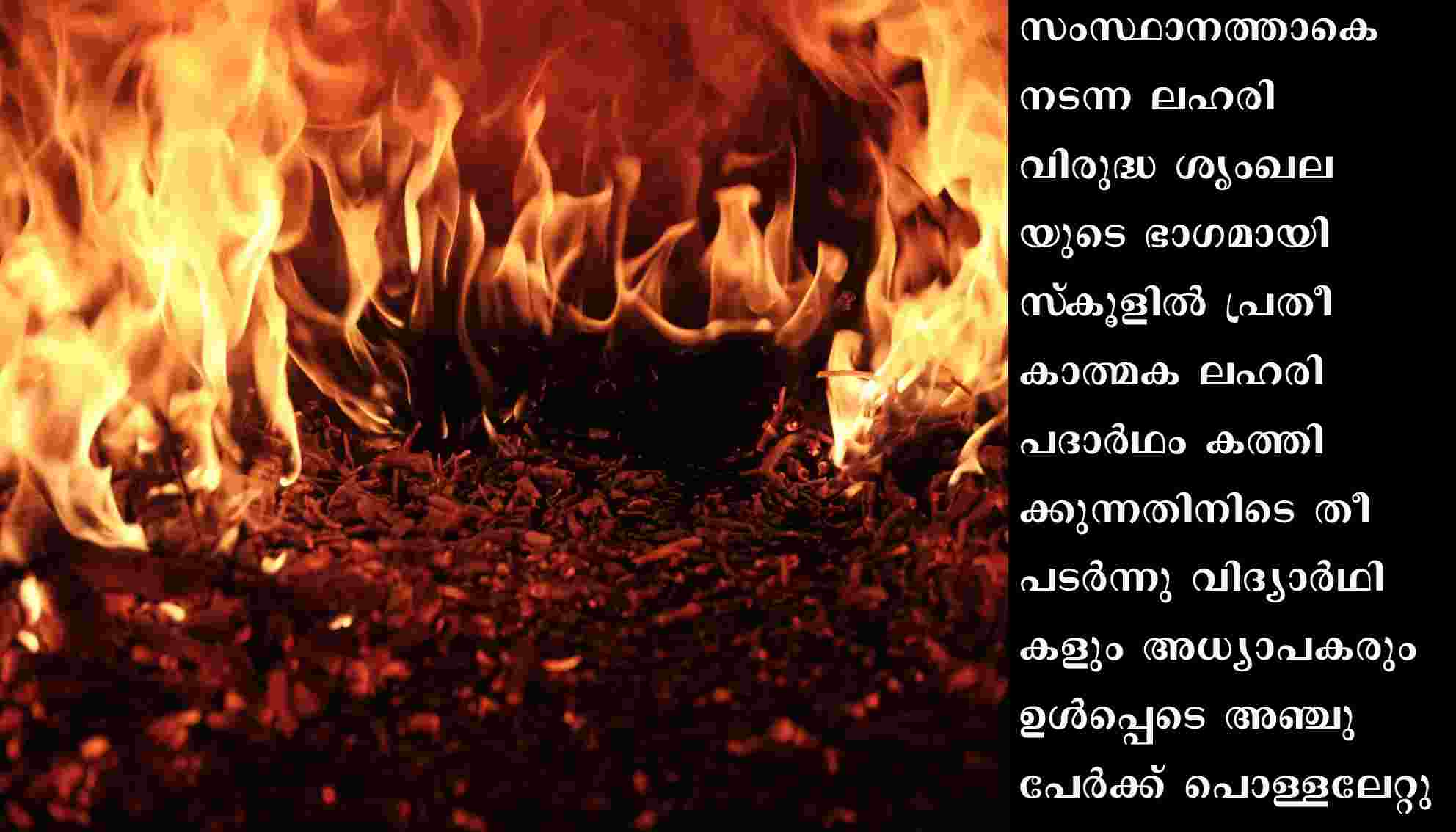 01/11/2022 ഉച്ചകഴിഞ്ഞു ലഹരി വിരുദ്ധ ശൃംഖല തീര്ത്തശേഷം, സിഗരറ്റിന്റെ മാതൃക നിര്മിച്ചതു കത്തിക്കുകയായിരുന്നു. സാനിറ്റൈസര് പുരട്ടിയ തുണിയിലാണ് സിഗരറ്റിന്റെ മാതൃക നിര്മിച്ചത്. നന്നായി കത്താത്തതിനെത്തുടര്ന്നു വീണ്ടും മണ്ണെണ്ണയൊഴിച്ചതോടെ തീ ആളിപടര്ന്നാണ് ചുറ്റും നിന്നവര്ക്കു പൊള്ളലേറ്റത്.