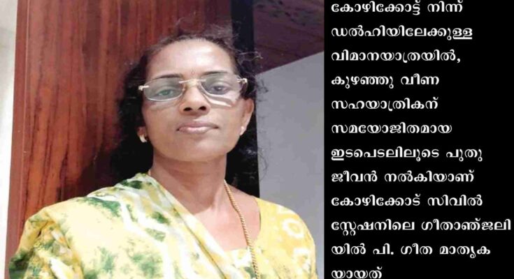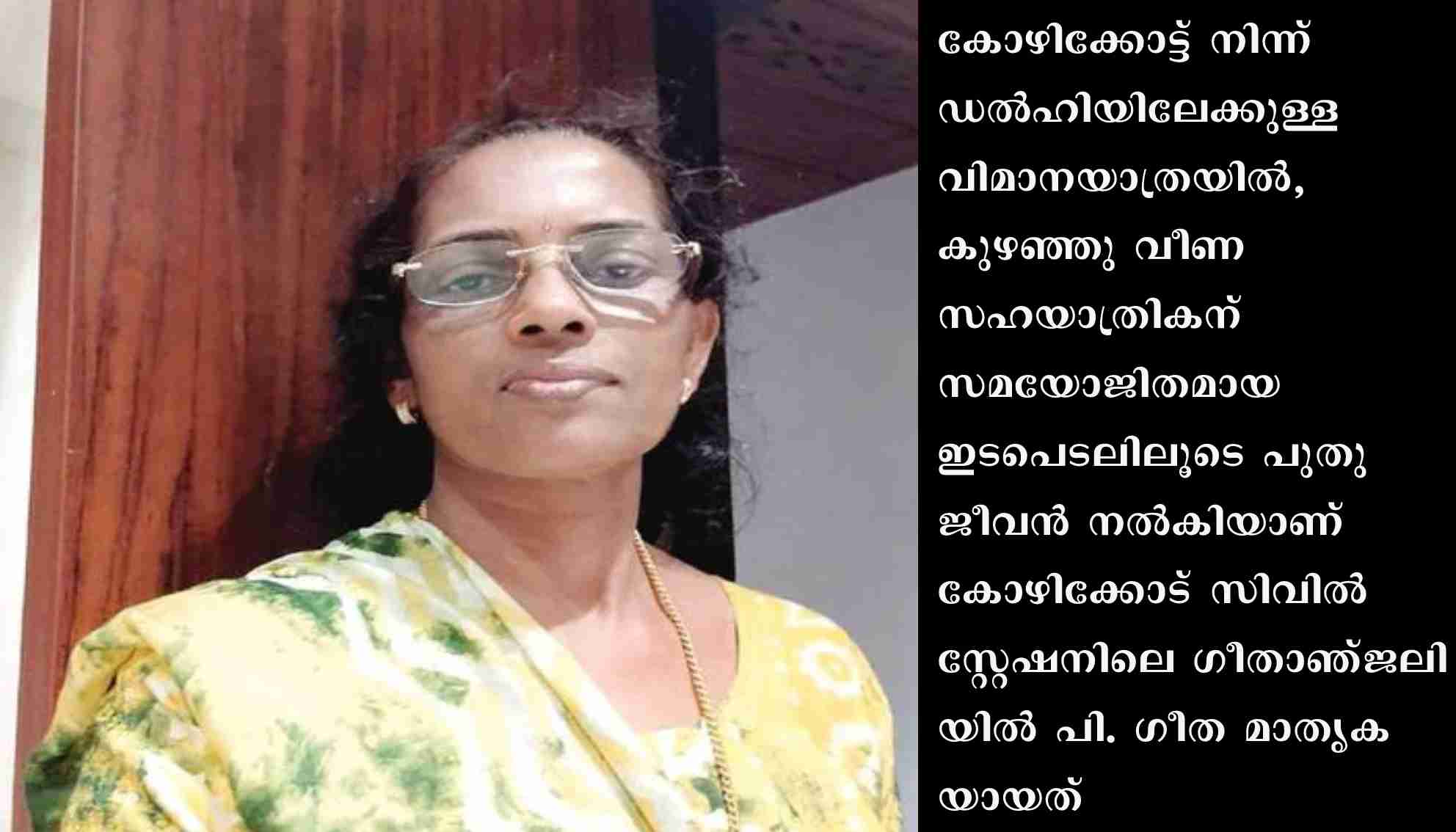 ന്യൂഡൽഹി: 2020-ലെ ദേശീയ ഫ്‌ലോറൻസ് നൈറ്റിംഗേൽ പുരസ്‌കാരത്തിന് അർഹയായതിന് രാഷ്ട്രപതിയുടെ ആശംസകളേറ്റുവാങ്ങാനുള്ള യാത്രയിൽ വിമാനത്തിലും ആതുരസേവനത്തിന്റെ മാതൃകയായി കോഴിക്കോട്ടുകാരി. കോഴിക്കോട്ട് നിന്ന് ഡൽഹിയിലേക്കുള്ള വിമാനയാത്രയിൽ, കുഴഞ്ഞു വീണ സഹയാത്രികന് സമയോജിതമായ ഇടപെടലിലൂടെ പുതുജീവൻ നൽകിയാണ് കോഴിക്കോട് സിവിൽ സ്റ്റേഷനിലെ ഗീതാഞ്ജലിയിൽ പി. ഗീത മാതൃകയായത്. ഗീതയും വിമാനത്തിലുണ്ടായിരുന്ന രണ്ട് ഡോക്ടർമാരും ചേർന്നാണ് ജമ്മുവിൽ സൈനികനായ സുമൻ എന്ന 32-കാരന്റെ ജീവൻരക്ഷിച്ചത്.