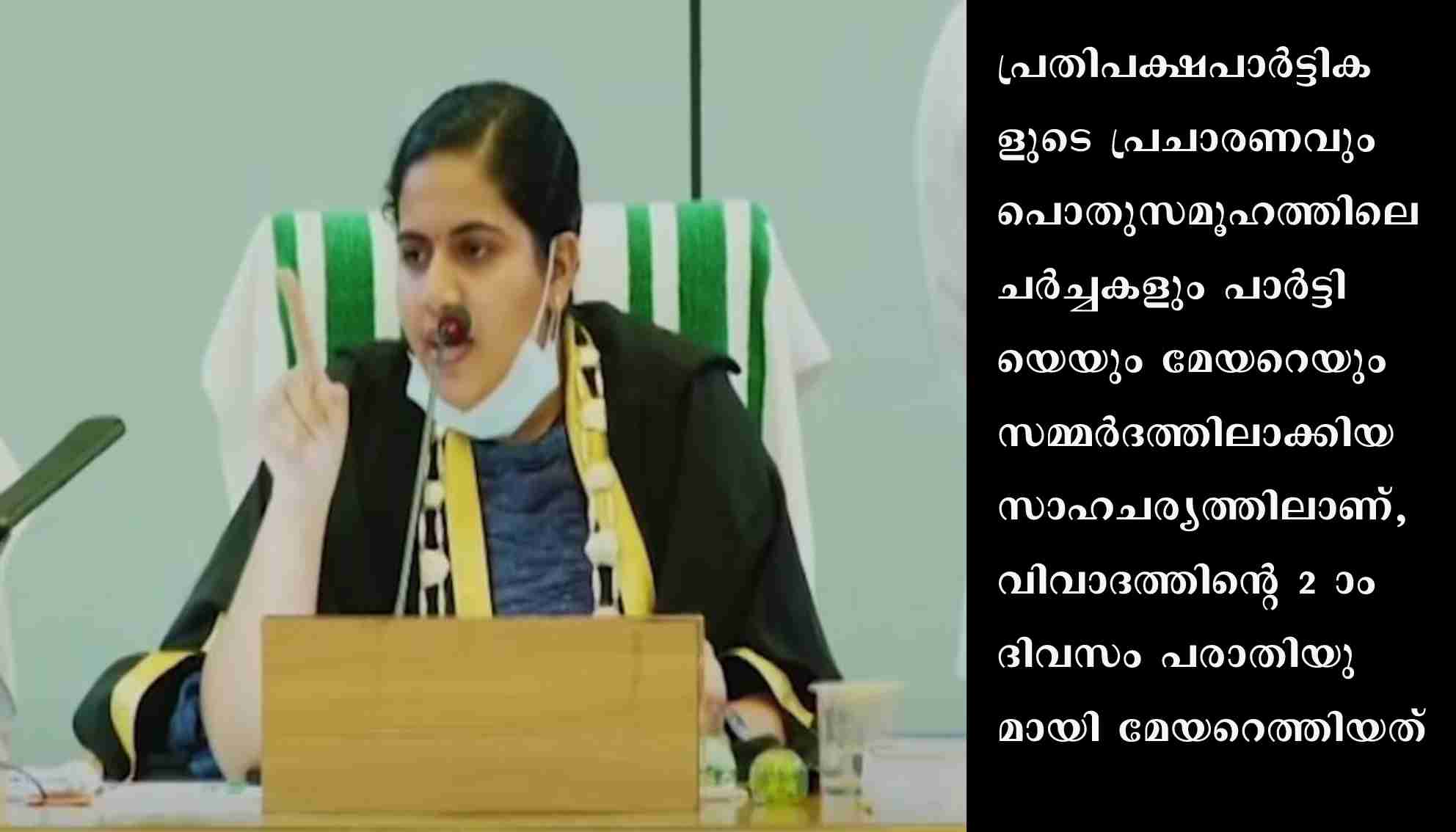 പാർട്ടി ജില്ലാനേതൃത്വം ഞായറാഴ്ച ഉച്ചയ്ക്കുശേഷം മേയറെ വിളിച്ചുവരുത്തി വിശദീകരണം ആവശ്യപ്പെട്ടിരുന്നു. അവിടെ മുതിർന്ന നേതാക്കളോട് ചർച്ച ചെയ്തശേഷമാണ് മേയർ മുഖ്യമന്ത്രിയുടെ ഓഫീസിലെത്തി കത്തിന്റെ ഉറവിടത്തെക്കുറിച്ച് അന്വേഷിക്കണമെന്ന് പരാതി നൽകിയത്. പിന്നീട് ഔദ്യോഗിക വസതിയായ ക്ലിഫ് ഹൗസിലെത്തി മുഖ്യമന്ത്രി പിണറായി വിജയനുമായി കൂടിക്കാഴ്ച നടത്തി. തുടർന്നായിരുന്നു പത്രസമ്മേളനം. സംഭവത്തിൽ മേയർ നേരിട്ട് പ്രതികരിക്കാനുള്ള തീരുമാനം ഈ ചർച്ചയ്ക്കുശേഷമായിരുന്നു. ഡി.ജി.പി. അനിൽകാന്തും ക്ലിഫ് ഹൗസിലെത്തിയിരുന്നു.