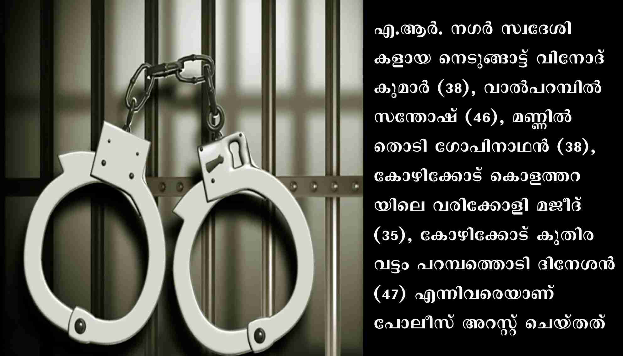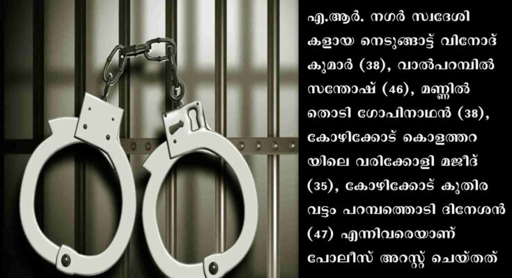എ.ആര്‍. നഗര്‍ സ്വദേശികളായ നെടുങ്ങാട്ട് വിനോദ് കുമാര്‍ (38), വാല്‍പറമ്പില്‍ സന്തോഷ് (46), മണ്ണില്‍തൊടി ഗോപിനാഥന്‍ (38), കോഴിക്കോട് കൊളത്തറയിലെ വരിക്കോളി മജീദ് (35), കോഴിക്കോട് കുതിരവട്ടം പറമ്പത്തൊടി ദിനേശന്‍ (47) എന്നിവരെയാണ് പോലീസ് അറസ്റ്റ് ചെയ്തത്. ചിറമംഗലം ജങ്ഷനില്‍നിന്ന് ഖാലിദ് എന്നയാളുടെ ഓട്ടോറിക്ഷ ചിറമംഗലത്തുള്ള റഷീദ് എന്നയാള്‍ ഓട്ടം വിളിച്ച് തലപ്പാറയില്‍ വന്നത്. അവിടെ വച്ച് മുന്‍പ് കഞ്ചാവ് കേസില്‍ ഉള്‍പ്പെട്ടിട്ടുള്ള വിനോദ് കുമാറിനും സുഹൃത്തുക്കളായ കോഴിക്കോട് സ്വദേശികളായ ദിനേശന്‍, മജീദ് എന്നിവര്‍ക്കുമാണ് റഷീദ് കഞ്ചാവെന്ന വ്യാജേന ഉണക്കപ്പുല്ല് പാക്കറ്റിലാക്കി നല്‍കിയത്. ഇതിന് 20000 രൂപ കൈപ്പറ്റുകയും ചെയ്തു. തുടര്‍ന്ന് ഓട്ടോയില്‍ കയറിപ്പോയ റഷീദിന്റെ വെപ്രാളംകണ്ട് സംശയം തോന്നിയ വിനോദ്കുമാര്‍ കവര്‍ പരിശോധിച്ചപ്പോള്‍ കഞ്ചാവിനു പകരം ഉണങ്ങിയ പുല്ലാണെന്നു മനസിലാക്കി.