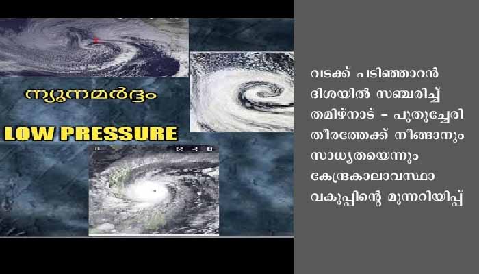 തിരുവനന്തപുരം: തെക്ക് പടിഞ്ഞാറന്‍ ബംഗാള്‍ ഉള്‍കടലില്‍ രൂപപ്പെട്ട ന്യൂനമര്‍ദ്ദം അടുത്ത 48 മണിക്കൂറിനുള്ളില്‍ ശക്തി പ്രാപിക്കാനും നവംബര്‍ 9 മുതല്‍ 12 വരെ വടക്ക് പടിഞ്ഞാറന്‍ ദിശയില്‍ സഞ്ചരിച്ച് തമിഴ്നാട് – പുതുച്ചേരി തീരത്തേക്ക് നീങ്ങാനും സാധ്യതയെന്നും കേന്ദ്രകാലാവസ്ഥാ വകുപ്പിന്റെ മുന്നറിയിപ്പ്. ഇതിന്റെ ഫലമായി കേരളത്തില്‍ നവംബര്‍ 12, 13 തീയതികളില്‍ വ്യാപകമായ മഴയ്ക്കും ഒറ്റപ്പെട്ട സ്ഥലങ്ങളില്‍ ശക്തമായ മഴക്കും സാധ്യതയെന്നും അറിയിപ്പില്‍ പറയുന്നു.