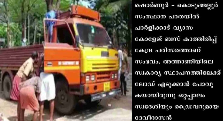ഷൊർണൂർ – കൊടുങ്ങല്ലൂർ സംസ്ഥാന പാതയിൽ പാർളിക്കാട് വ്യാസ കോളേജ് ബസ് കാത്തിരിപ്പ് കേന്ദ്ര പരിസരത്താണ് സംഭവം. അത്താണിയിലെ സ്വകാര്യ സ്ഥാപനത്തിലേക്ക് ലോഡ് എടുക്കാൻ പോവുകയായിരുന്നു ഒറ്റപ്പാലം സ്വദേശിയും ഡ്രൈവറുമായ ദേവീദാസൻ. വണ്ടിയെടുത്ത് മുപ്പത് കിലോമീറ്ററിലേറെ സഞ്ചരിച്ചു കാണും. ഡ്രൈവിംഗ് സീറ്റിനരികിൽ വലതു വശത്തു നിന്നും പാമ്പ് തല പൊക്കിയതോടെ ദാസൻ ഭീതിയിലായി. വല്ലവിധേനയും വാഹനം സഡൻ ബ്രേക്കിട്ട് ചവിട്ടി നിർത്തി ചാടിയിറങ്ങി രക്ഷതേടുകയായിരുന്നു.