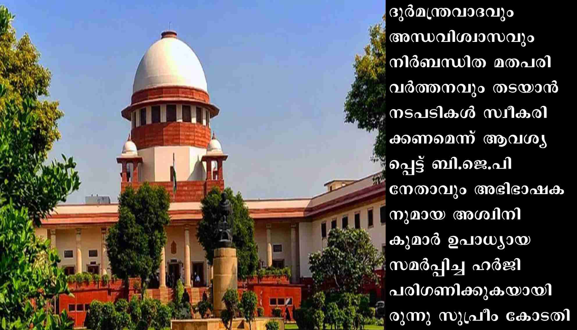 ദുർമന്ത്രവാദവും അന്ധവിശ്വാസവും നിർബന്ധിത മതപരിവർത്തനവും തടയാൻ നടപടികൾ സ്വീകരിക്കണമെന്ന് ആവശ്യപ്പെട്ട് ബി.ജെ.പി നേതാവും അഭിഭാഷകനുമായ അശ്വിനി കുമാർ ഉപാധ്യായ സമർപ്പിച്ച ഹർജി പരിഗണിക്കുകയായിരുന്നു സുപ്രീം കോടതി. ജസ്റ്റിസുമാരായ എം.ആർ ഷാ, ഹിമ കോശി അംഗങ്ങളായ ബെഞ്ചാണ് ഹരജിയിൽ വാദംകേട്ടത്. മതപരിവർത്തനവുമായി ബന്ധപ്പെട്ട് ആരോപിക്കപ്പെടുന്ന വിഷയങ്ങൾ ശരിയാണെങ്കിൽ അതു രാജ്യസുരക്ഷയെ ബാന്ധിക്കുന്നതാണെന്ന് നിരീക്ഷിച്ച കോടതി ഈ മാസം 22നുമുൻപ് വിഷയത്തിൽ സത്യവാങ്മൂലം സമർപ്പിക്കാൻ കേന്ദ്രത്തോട് ആവശ്യപ്പെട്ടു. 2022നവംബർ 28ന് ഹർജിയിൽ വീണ്ടും വാദം കേൾക്കും.