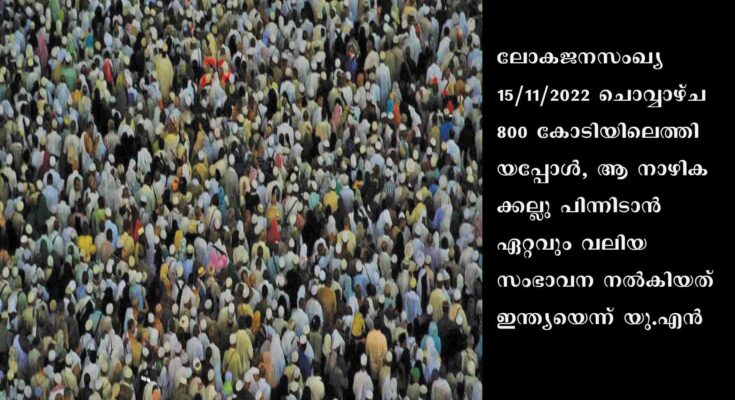 ന്യൂഡല്ഹി: ലോകജനസംഖ്യ 15/11/2022 ചൊവ്വാഴ്ച 800 കോടിയിലെത്തിയപ്പോള്, ആ നാഴികക്കല്ലു പിന്നിടാന് ഏറ്റവും വലിയ സംഭാവന നല്കിയത് ഇന്ത്യയെന്നു യു.എന്. 17.7 കോടിയാണ് ഈ കാലയളവില് ഇന്ത്യയിലെ ജനസംഖ്യാ വര്ധന. ആഗോളതലത്തില് അടുത്ത നൂറുകോടിയിലേക്ക് ജനസംഖ്യ എത്തുമ്പോള് ചൈനയുടെ സംഭാവന നെഗറ്റീവ് ആയിരിക്കുമെന്നും യു.എന്. കണക്കുകൂട്ടുന്നു. അടുത്ത വര്ഷം ആദ്യംതന്നെ ചൈനയുടെ ജനസംഖ്യാനിരക്കില് വലിയ കുറവുണ്ടാകും. അടുത്ത വര്ഷം ചൈനയെ മറികടന്ന് ഇന്ത്യ ലോകത്തെ ഏറ്റവും കൂടുതല് ജനസംഖ്യയുള്ള രാജ്യമാകുമെന്നും വിലയിരുത്തല്.