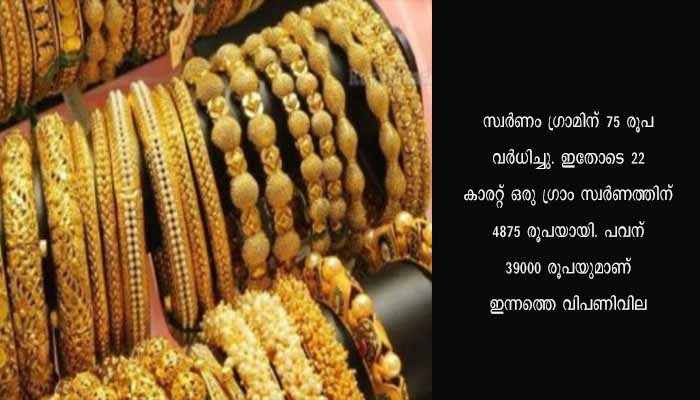 തിരുവനന്തപുരം : സംസ്ഥാനത്ത് 17/11/22 വ്യാഴാഴ്ച സ്വര്ണവില കുതിച്ചുയര്ന്നു. 17/11/22 വ്യാഴാഴ്ച സ്വര്ണം ഗ്രാമിന് 75 രൂപ വര്ധിച്ചു. പവന് 600 രൂപയുടെയും വര്ധനവുണ്ടായി. ഇതോടെ 22 കാരറ്റ് ഒരു ഗ്രാം സ്വര്ണത്തിന് 4875 രൂപയായി. പവന് 39000 രൂപയുമാണ് 17/11/22 വ്യാഴാഴ്ചത്തെ വിപണിവില.