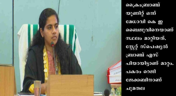തിരുവനന്തപുരം: മേയർ ആര്യ രാജേന്ദ്രന്റെ കത്ത് വിവാദത്തെക്കുറിച്ച് അന്വേഷിക്കുന്ന ഉദ്യോഗസ്ഥന് സ്ഥലംമാറ്റം. ക്രൈംബ്രാഞ്ച് യൂണിറ്റ് ഒന്ന് മേധാവി കെ ഇ ബൈജുവിനെയാണ് സ്ഥലം മാറ്റിയത്. സ്റ്റേറ്റ് സ്പെഷ്യൽ ബ്രാഞ്ച് എസ് പിയായിട്ടാണ് മാറ്റം. പകരം റെജി ജേക്കബിനാണ് ചുമതല.