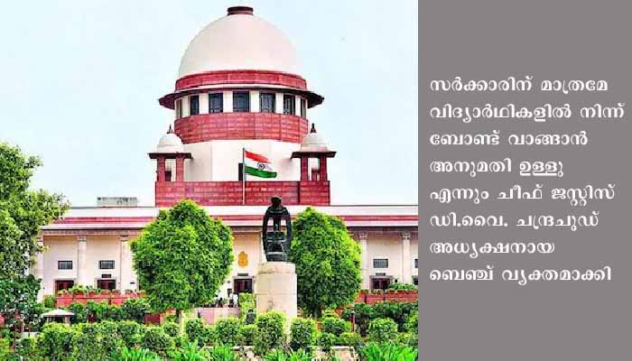 ന്യൂഡല്‍ഹി: സ്വകാര്യ മെഡിക്കല്‍ കോളേജുകള്‍ക്ക് വിദ്യാര്‍ഥികളില്‍ നിന്ന് ബോണ്ട് വാങ്ങാനാകില്ലെന്ന് സുപ്രീം കോടതി. സര്‍ക്കാരിന് മാത്രമേ വിദ്യാര്‍ഥികളില്‍ നിന്ന് ബോണ്ട് വാങ്ങാന്‍ അനുമതി ഉള്ളു എന്നും ചീഫ് ജസ്റ്റിസ് ഡി.വൈ. ചന്ദ്രചൂഡ് അധ്യക്ഷനായ ബെഞ്ച് വ്യക്തമാക്കി. സ്വകാര്യ മെഡിക്കല്‍ കോളേജുകള്‍ ബോണ്ട് വാങ്ങുന്നത് ഞെട്ടല്‍ ഉളവാക്കുന്നുവെന്നും കോടതി നിരീക്ഷിച്ചു. മെഡിക്കല്‍ പഠനം പൂര്‍ത്തിയായതിന് ശേഷം ഒരു വര്‍ഷം തങ്ങളുടെ കോളേജില്‍ പഠിക്കുകയോ അല്ലെങ്കില്‍ അഞ്ച് ലക്ഷം രൂപ നല്‍കുകയോ ചെയ്യണമെന്ന് സ്വകാര്യ മെഡിക്കല്‍ കോളേജ് ബോണ്ട് വാങ്ങിയതിന് എതിരെ സമര്‍പ്പിച്ച ഹര്‍ജിയിലാണ് സുപ്രീംകോടതിയുടെ നിര്‍ണായക ഉത്തരവ്. സര്‍വീസില്‍ ഉള്ളവര്‍ പഠനം നടത്തുമ്പോള്‍ സര്‍ക്കാറിന് ബോണ്ട് വാങ്ങാം. മറ്റ് ആര്‍ക്കും അതിന് അധികാരം ഇല്ലെന്ന് സുപ്രീം കോടതി വ്യക്തമാക്കി. പഠനം പൂര്‍ത്തിയാക്കി മൂന്ന് വര്‍ഷം കഴിഞ്ഞാണ് വിദ്യാര്‍ഥി കോടതിയെ സമീപിച്ചത്. പണം തിരികെ നല്‍കാന്‍ വൈകിയാല്‍ എട്ട് ശതമാനം പലിശ കൂടി ഈടാക്കാന്‍ വ്യവസ്ഥ ചെയ്യുന്നതായിരുന്നു ബോണ്ട്.