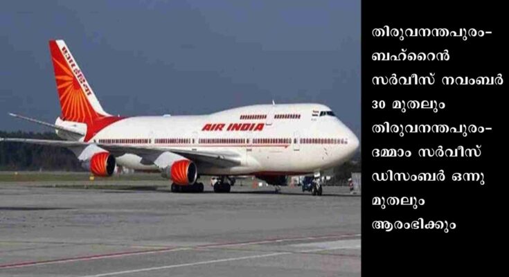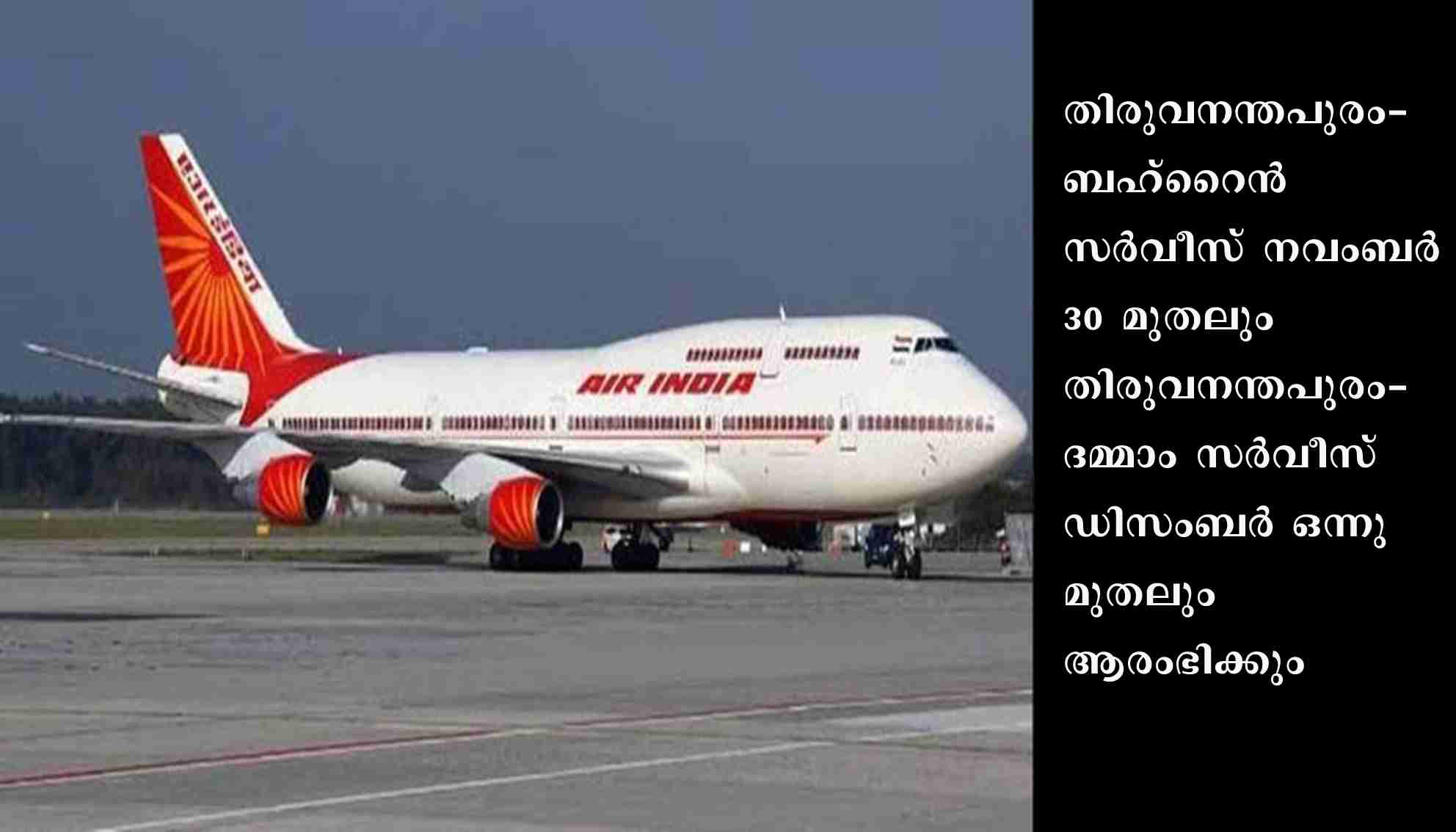 തിരുവനന്തപുരം: തിരുവനന്തപുരം രാജ്യാന്തര വിമാനത്താവളത്തില് നിന്ന് എയര് ഇന്ത്യ എക്സ്പ്രസ് 2 രാജ്യാന്തര സര്വീസുകള് കൂടി ആരംഭിക്കും. തിരുവനന്തപുരം-ബഹ്റൈന് സര്വീസ് നവംബർ 30 മുതലും തിരുവനന്തപുരം-ദമ്മാം സര്വീസ് ഡിസംബര് ഒന്നു മുതലും ആരംഭിക്കും.