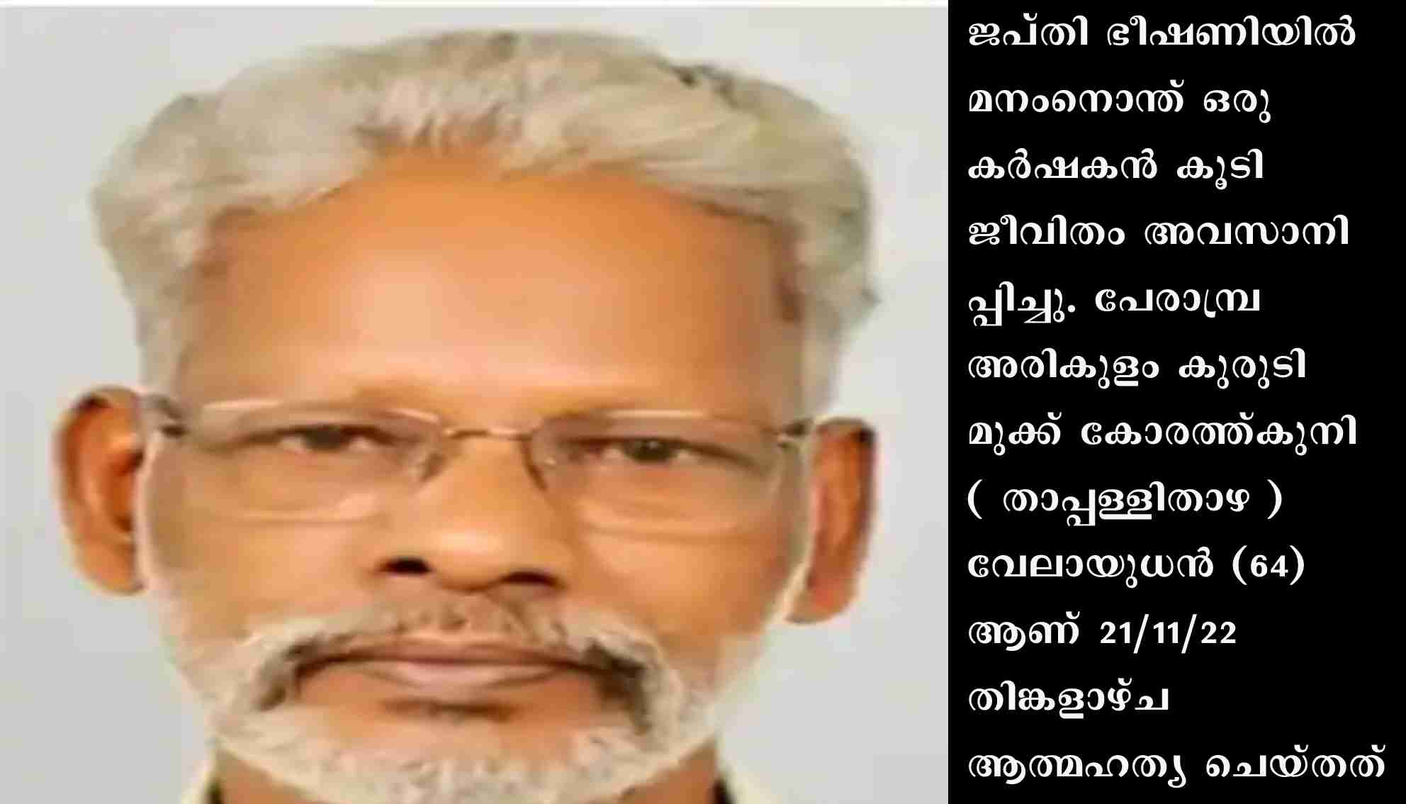 കോഴിക്കോട്: ജപ്തി ഭീഷണിയിൽ മനംനൊന്ത് ഒരു കർഷകൻ കൂടി ജീവിതം അവസാനിപ്പിച്ചു. പേരാമ്പ്ര അരികുളം കുരുടിമുക്ക് കോരത്ത്കുനി ( താപ്പള്ളിതാഴ ) വേലായുധൻ (64) ആണ് 21/11/22 തിങ്കളാഴ്ച ആത്മഹത്യ ചെയ്തത്. വേലായുധൻ ആത്മഹത്യ ചെയ്തത് ജപ്തി ഭീഷണിയെ തുടർന്നാണെന്ന് ബന്ധുക്കൾ ആരോപിക്കുന്നു. 21/11/22 തിങ്കളാഴ്ച വൈകിട്ട് വീട്ടുവളപ്പിലെ മാവിലാണ് വേലായുധനെ തൂങ്ങി മരിച്ച നിലയിൽ കണ്ടെത്തുന്നത്.