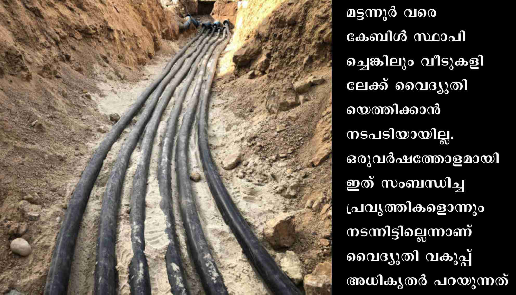മട്ടന്നൂര്‍ വരെ കേബിള്‍ സ്ഥാപിച്ചെങ്കിലും വീടുകളിലേക്ക് വൈദ്യുതിയെത്തിക്കാന്‍ നടപടിയായില്ല. ഒരുവര്‍ഷത്തോളമായി ഇത് സംബന്ധിച്ച പ്രവൃത്തികളൊന്നും നടന്നിട്ടില്ലെന്നാണ് വൈദ്യുതി വകുപ്പ് അധികൃതര്‍ പറയുന്നത്.