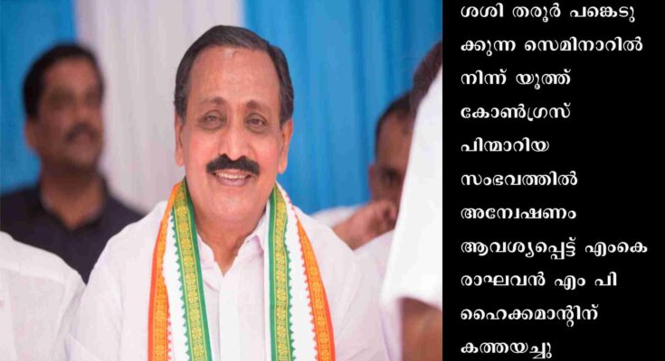 കോഴിക്കോട് : ശശി തരൂര് പങ്കെടുക്കുന്ന സെമിനാറില് നിന്ന് യൂത്ത് കോൺഗ്രസ് പിന്മാറിയ സംഭവത്തില് അന്വേഷണം ആവശ്യപ്പെട്ട് എംകെ രാഘവൻ എം പി ഹൈക്കമാന്റിന് കത്തയച്ചു. തരൂരിനെ വിലക്കിയവർക്കെതിരെ നടപടി വേണമെന്നാണ് കത്തിലെ ആവശ്യം. രാഹുൽ ഗാന്ധി, എഐസിസി അധ്യക്ഷൻ മല്ലികാർജുന ഖർഗെ എന്നിവർക്കാണ് കത്തയച്ചത്.