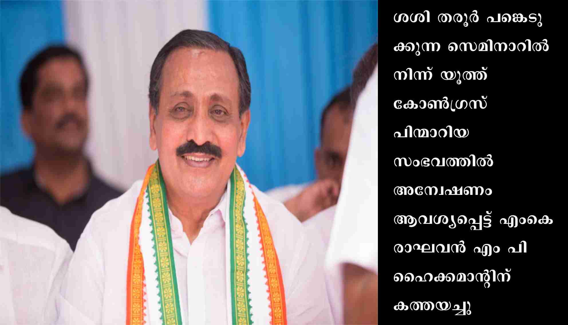 കോഴിക്കോട് : ശശി തരൂര് പങ്കെടുക്കുന്ന സെമിനാറില് നിന്ന് യൂത്ത് കോൺഗ്രസ് പിന്മാറിയ സംഭവത്തില് അന്വേഷണം ആവശ്യപ്പെട്ട് എംകെ രാഘവൻ എം പി ഹൈക്കമാന്റിന് കത്തയച്ചു. തരൂരിനെ വിലക്കിയവർക്കെതിരെ നടപടി വേണമെന്നാണ് കത്തിലെ ആവശ്യം. രാഹുൽ ഗാന്ധി, എഐസിസി അധ്യക്ഷൻ മല്ലികാർജുന ഖർഗെ എന്നിവർക്കാണ് കത്തയച്ചത്.