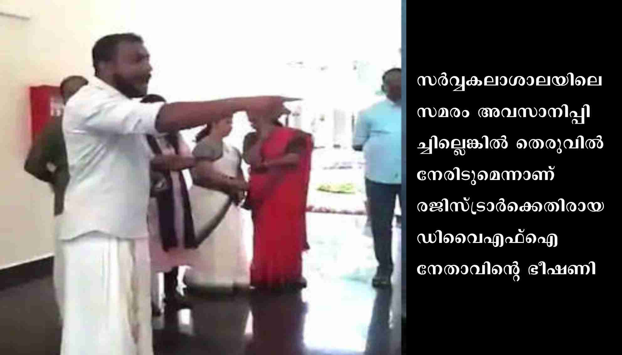 തൃശ്ശൂര്: കാർഷിക സർവകലാശാല രജിസ്ട്രാർക്കെതിരെ ഡിവൈഎഫ്ഐ നേതാവിന്റെ ഭീഷണി. സർവ്വകലാശാലയിലെ സമരം അവസാനിപ്പിച്ചില്ലെങ്കിൽ തെരുവിൽ നേരിടുമെന്നാണ് രജിസ്ട്രാര്ക്കെതിരായ ഡിവൈഎഫ്ഐ നേതാവിന്റെ ഭീഷണി. ജോലി കഴിഞ്ഞ് വീട്ടിലേക്ക് മടങ്ങുമ്പോൾ യുവജന, വിദ്യാർഥി സംഘടനകൾ നാട്ടിൽ ഉണ്ടെന്ന കാര്യം രജിസ്ട്രാര് ഓർക്കണമെന്നും ഡിവൈഎഫ്ഐ മണ്ണൂത്തി മേഖലാ സെക്രട്ടറിയും കോർപ്പറേഷൻ കൗൺസിലറുമായ അനീസ് അഹമ്മദാണ് രജിസ്ട്രാറെ താക്കീത് ചെയ്തിരിക്കുന്നത്. രജിസ്ട്രാറെ ഉപരോധിച്ചുള്ള സമരത്തിനിടെയാണ് നേതാവിൻ്റെ ഭീഷണി പ്രസംഗം. മന്ത്രി കെ. രാജനെതിരെയും പ്രസംഗത്തിനിടെ ഡിവൈഎഫ്ഐ നേതാവ് രൂക്ഷവിമര്ശനം നടത്തി.