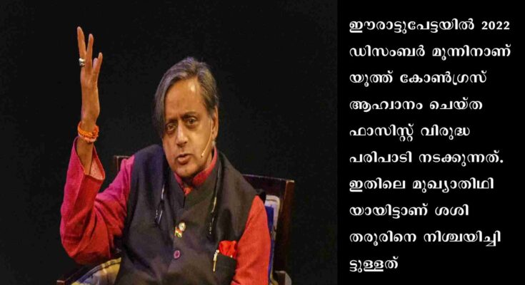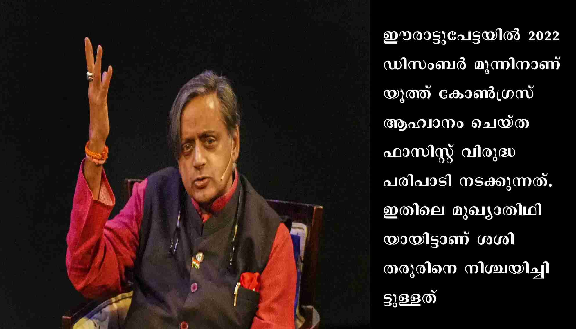 ഈരാട്ടുപേട്ടയിൽ 2022 ഡിസംബർ മൂന്നിനാണ് യൂത്ത് കോൺഗ്രസ് ആഹ്വാനം ചെയ്ത ഫാസിസ്റ്റ് വിരുദ്ധ പരിപാടി നടക്കുന്നത്. ഇതിലെ മുഖ്യാതിഥിയായിട്ടാണ് ശശി തരൂരിനെ നിശ്ചയിച്ചിട്ടുള്ളത്.ഈ പരിപാടിയിലെ പോസ്റ്ററുകളിൽ വി.ഡി സതീശന്റെ ചിത്രം ഇല്ലാതിരുന്നതും നേരത്തെ വിവാദമായിരുന്നു. ഇതോടെ സതീശൻ ഉൾപ്പെടെ കൂടുതൽ നേതാക്കളുടെ ചിത്രങ്ങൾ ഉൾപ്പെടുത്തി പുതിയ പോസ്റ്ററും യൂത്ത് കോൺഗ്രസ് പുറത്തിറക്കിയിരുന്നു.