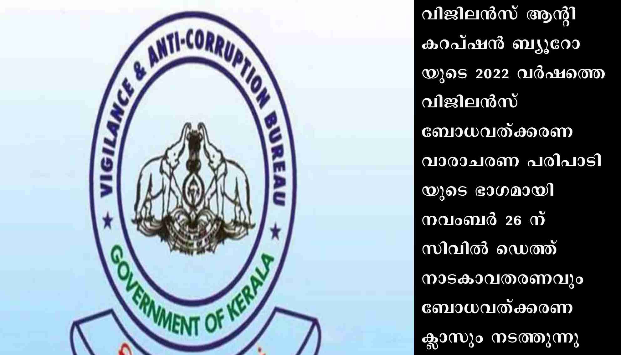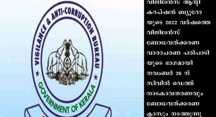 പാലക്കാട്: വിജിലന്സ് ആന്റി കറപ്ഷന് ബ്യൂറോയുടെ 2022 വര്ഷത്തെ വിജിലന്സ് ബോധവത്ക്കരണ വാരാചരണ പരിപാടിയുടെ ഭാഗമായി നവംബര് 26 ന് സിവില് ഡെത്ത് നാടകാവതരണവും ബോധവത്ക്കരണ ക്ലാസും നടത്തുന്നു. സര്ക്കാര് ജീവനക്കാര്ക്കും പൊതുജനങ്ങള്ക്കും വിദ്യാര്ത്ഥികള്ക്കും വിജിലന്സ് ബോധവത്ക്കരണം നല്കുന്നതിന്റെ ഭാഗമായാണ് പരിപാടി നടത്തുന്നത്.