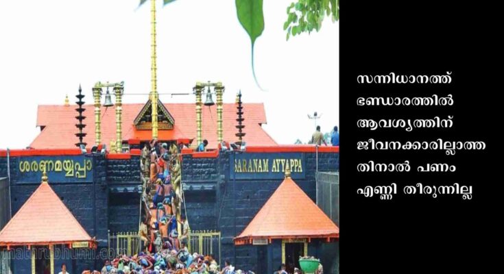 ശബരിമല: സന്നിധാനത്ത് ഭണ്ഡാരത്തില് ആവശ്യത്തിന് ജീവനക്കാരില്ലാത്തതിനാല് പണം എണ്ണി തീരുന്നില്ല. 141 ജീവനക്കാര് മാത്രമാണുള്ളത്. കുറഞ്ഞത് 200 പേരെങ്കിലും ഉണ്ടെങ്കിലെ അന്നന്ന് വരുന്ന പണം പൂര്ണമായി എണ്ണിത്തീരുകയുള്ളൂ. ശ്രീകോവിലിന് മുന്നിലെ ഹുണ്ടികയില് നിന്നും കണ്വയര് ബല്റ്റ് വഴി വരുന്ന പണവും ശബരീപീഠം മുതല് സന്നിധാനത്ത് വിവിധ ഭാഗങ്ങളില് സ്ഥാപിച്ചിരിക്കുന്ന 145 വഞ്ചികളിലേയും മഹാകാണിക്കയിലെയും പണവുമാണ് ഭണ്ഡാരത്തിലെത്തിച്ച് എണ്ണിത്തിട്ടപ്പെടുത്തി ബാങ്കിന് കൈമാറുന്നത്.